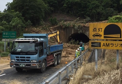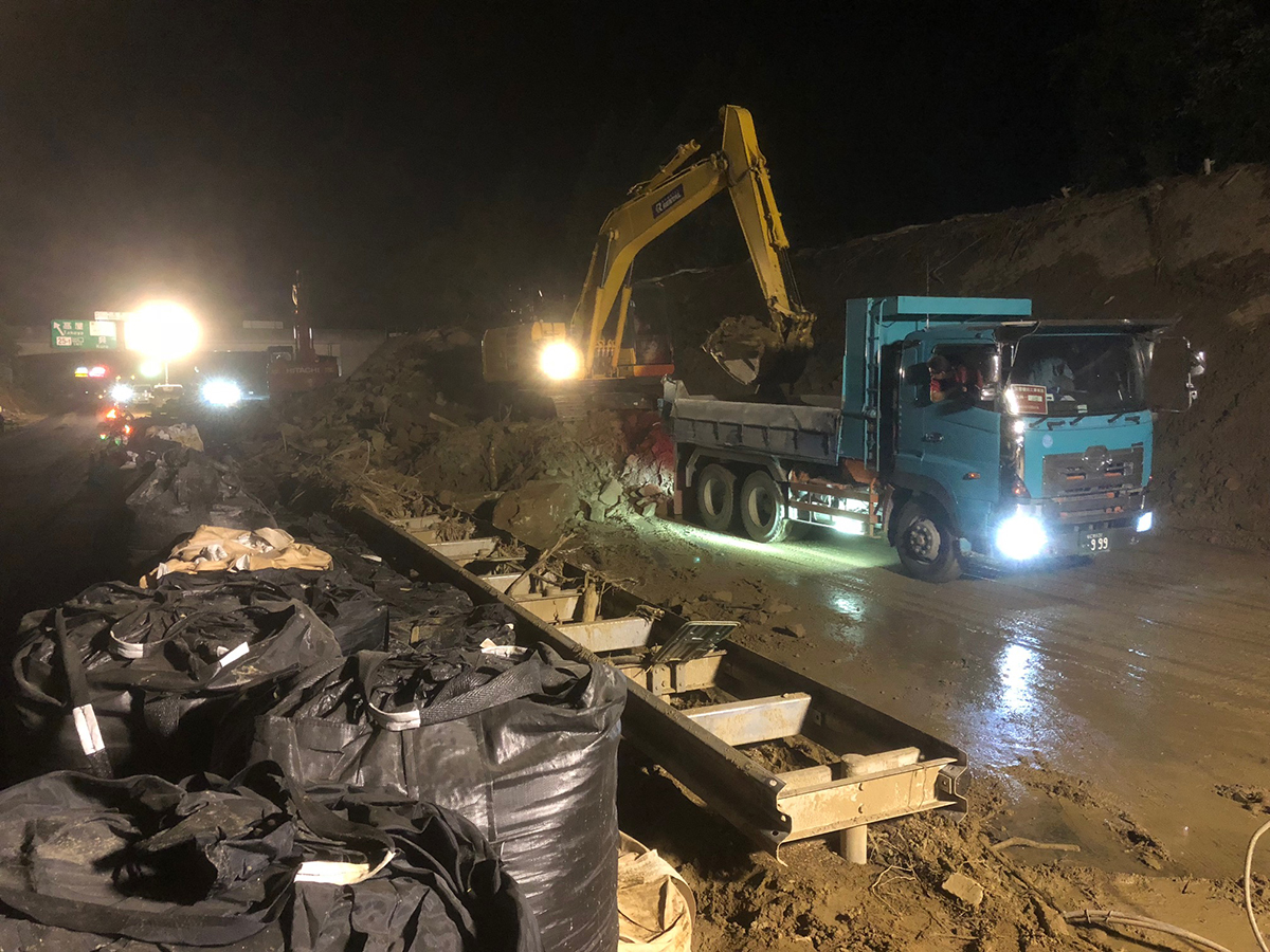 応急復旧作業はまず緊急車両の通行を可能にするために通行帯の確保に専念しました。一部区間では本線に流入した土砂を片側車線に寄せて1車線を確保して片側交互通行とするとともに、作業区間が連続していましたので中央分離帯の開口部を活用して対面通行とするなど速やかに啓開を行いました。