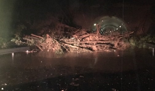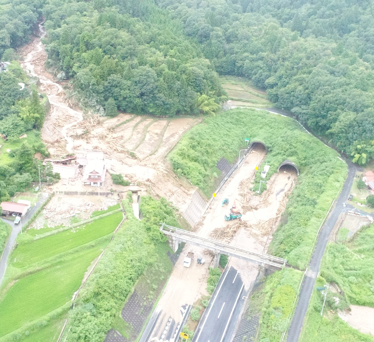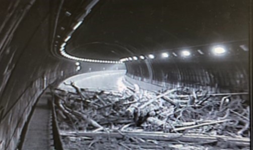 志和トンネル東坑口の被災状況/トンネル内部に流入した流木と土砂