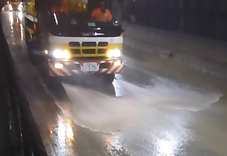 志和IC~広島東IC間の志和トンネルでは主に上り線に東坑口からトンネル内部に水を大量に含んだ土砂が流木とともに流入しました。トンネル内は交通開放時に土砂を可能な限り入念に除去しておかないと、砂埃により視界不良につながる恐れがあったことから、ホイールローダーに加えて除雪車(スノープラウ)を使って土砂を撤去し、さらに前方に高圧散水が可能な散水車で細やかな清掃を行いました。