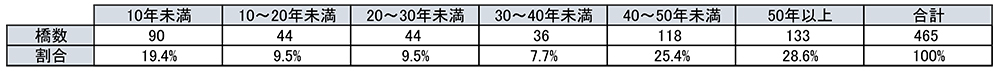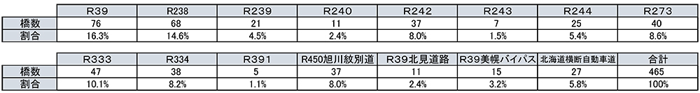 供用年次別では50年以上経過している橋梁が133橋(28.6%)、30年~50年未満が154橋、10年~30年未満が88橋、10年未満が90橋となっています。10年後に供用50年を超える橋梁の割合は54.0%、20年後には61.7%、30年後には71.2%に達します。路線別では国道39号が最も多く76橋を占めます。次いで国道238号(オホーツクライン)が68橋、国道333号が47橋となっています。