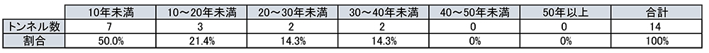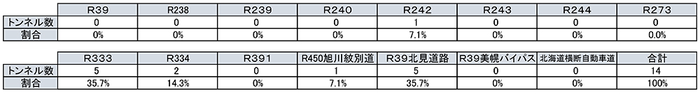 供用年次別では10年以上、同年未満ともに7箇所ずつで、平均供用年数は13年です。最も古いトンネルは国道334号のオシンコシントンネルで、20年後に供用50年を超える割合は14.3%となります。路線別では国道333号と国道39号北見道路が各5箇所、国道334号が2箇所、国道242号、国道450号旭川紋別道が各1箇所です。