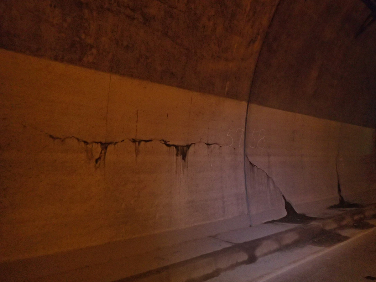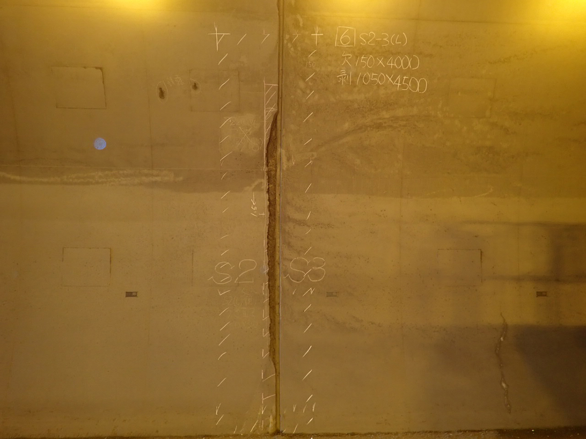 トンネルの主な劣化状況としては、覆工表面コンクリートの剥落がもっとも多く、次いでひび割れ損傷が多くなっており、一部でですが覆工面からの漏水も見られます。対策としては、剥落防止シート(可視繊維シート)の施工およびひび割れ注入による補修を実施、漏水については漏水防止板(面導水)を施工しています。