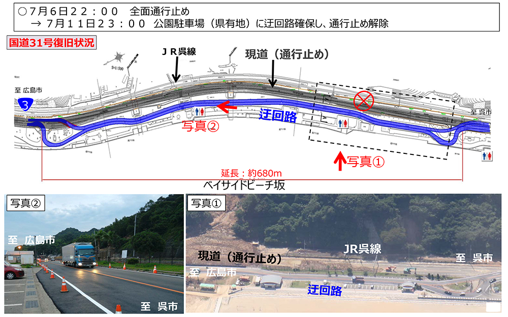 大規模な災害対応では、広島市内と呉市を結ぶ国道31号の復旧作業があります。海側から国道31号、JR呉線、広島呉道路が並走している箇所(安芸郡坂町水尻地区)で大規模な土砂崩落があり、3路線すべてが被災しました。国道31号の海側に県管理の公園の駐車場がありましたので、それを活用して早期に迂回路を確保するべく、6日の被災後、大型車が通行できるように舗装増厚などを突貫工事で行い、11日23時に約680mの仮設道路での通行止め解除ができました。国道31号本線を広島呉道路とJR呉線を復旧するための作業ヤードにすることができて復旧促進が図られたと、高速道路会社とJRからも感謝されました。本復旧は、9月12日に完了しています。