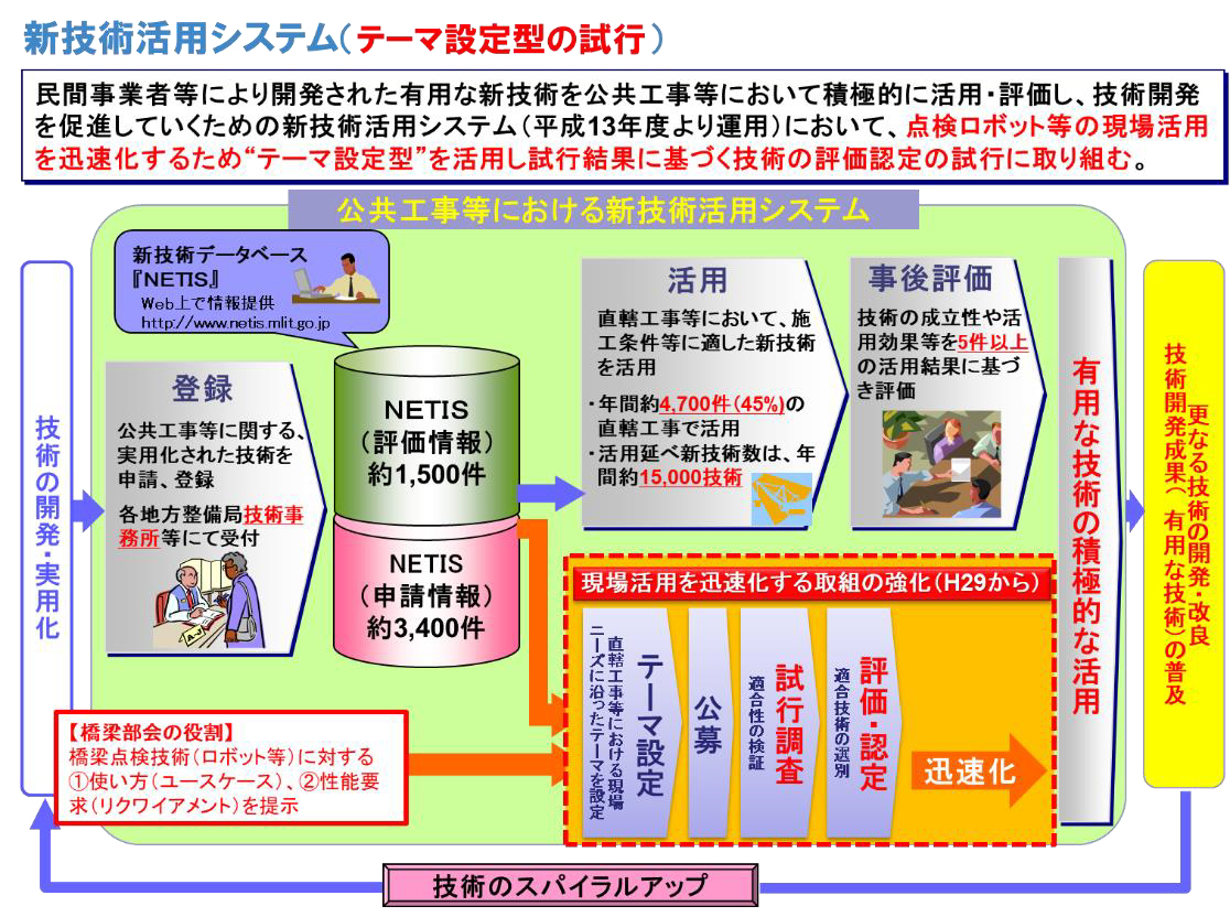 新田 道路橋点検記録作成支援ロボット技術の要求性能(案)に基づいて検証が行われることにより現場導入への道筋(「新技術活用制度」の改良スキーム)が設けられました。