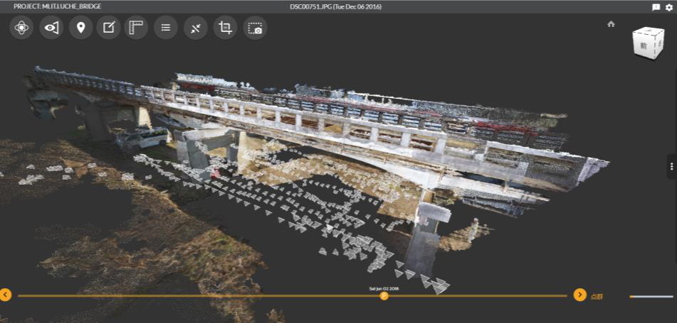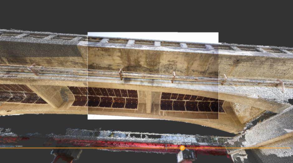 できた3D橋梁台帳は、様々な角度から構造物を見ることができ、しかもいちいち調べなくてもマウスカーソルを当てることで詳細な写真及び損傷状況、詳細なコメントを得ることができます。また撮影部位や方向も座標として固定できますので、時系列的な経年劣化もより詳細かつ正確に測定し、3次元橋梁台帳に紐づけすることができます。ある意味3次元ではなく4次元以上の橋梁台帳といえますね。