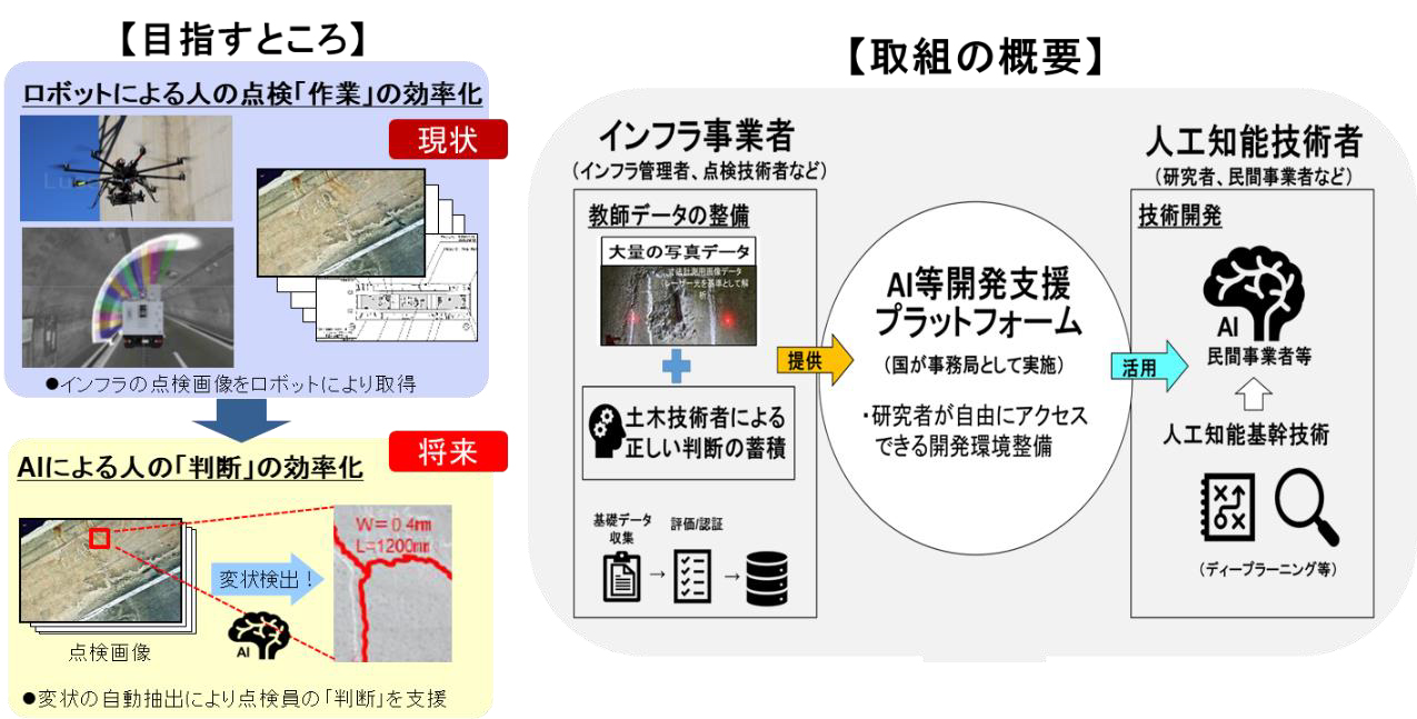 最後に、点検画像から損傷を読み取ることはディープラーニングAIの活用が可能な分野です。しかし、損傷を見つけるといった比較的単純な判断であっても、自動化するためには、「教師データ」を作る必要があります。テスト問題を出して、どれぐらいの正解率かというのをきちんと確認された環境を国交省や研究機関が率先して作る必要があります。先進的な技術ですが、AIやロボット技術者だけで開発することはできません。土木分野の専門家の知見を集約するとともに、評価項目や要求性能については国だけでなく、学識者や民間企業が知恵を出し合って取り組んでいくことが必要です。