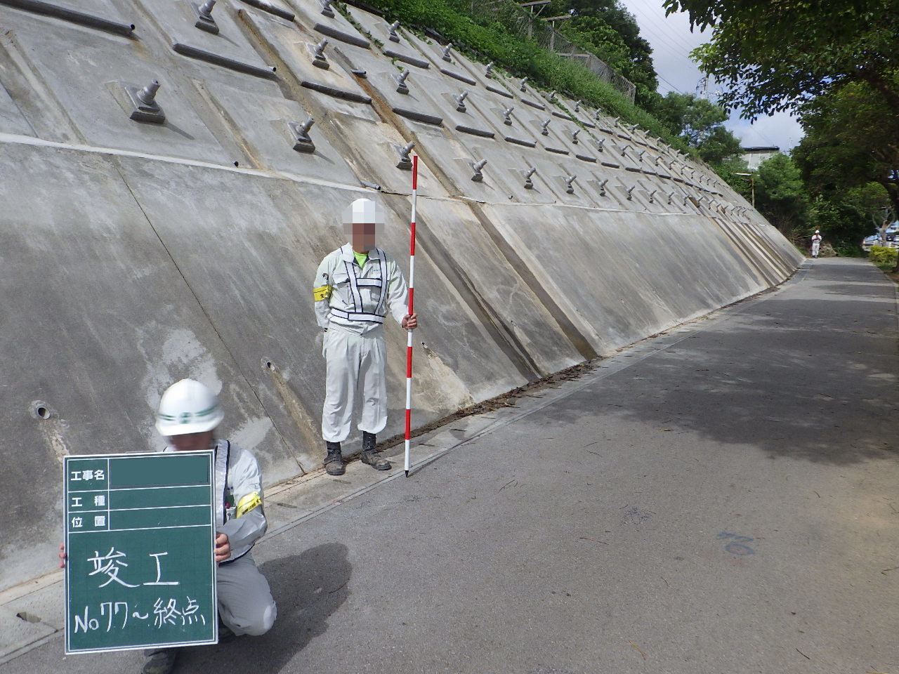 現在整備している道路で、島尻層泥岩がスレーキングを起こすような箇所(新里層)があるので、これまではのり枠植栽だったものをのり枠吹付、必要に応じてアンカーも入れるものに変更する対策を行っています。