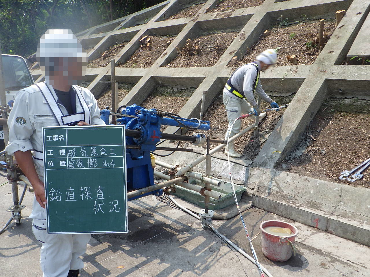 不発弾などが無いか磁気探査している状況(左)、法面の施工状況