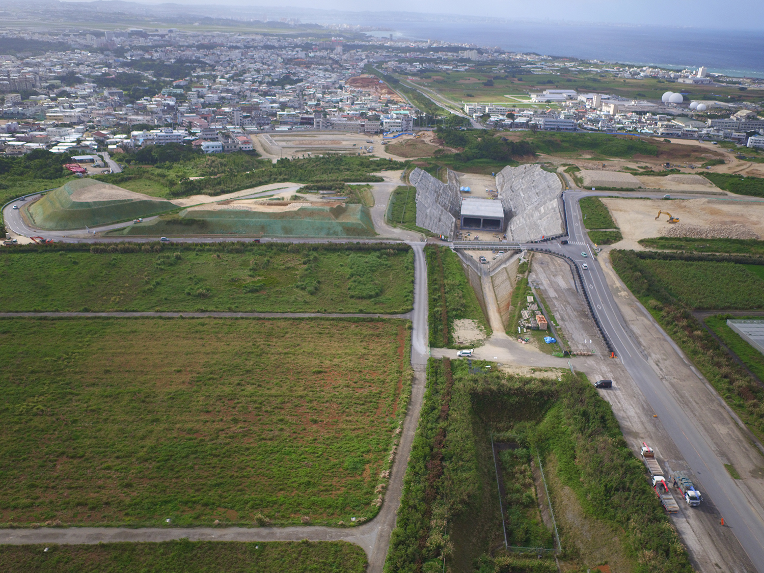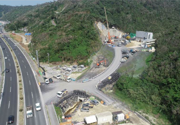 中間部の喜名~大木間0.9kmについては、県道6号線に隣接する部分(大木側)で土地区画整理事業が進んでおり、区画整理事業と調整しながら事業を進めていく予定です。また、読谷補助飛行場跡地付近から県道6号までは高低差があるため、南側は掘割、北側は開削トンネル(構造物的にはボックスカルバート)で施工していきます。2016年度から着工し、整備を進めています。同地域は琉球石灰岩であり地層に不規則に脆弱部が存在するため、施工には注意が必要です。