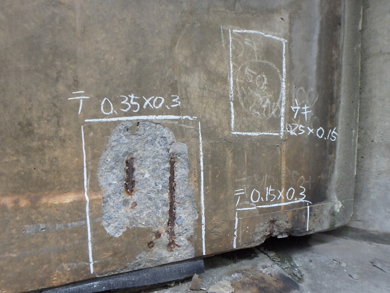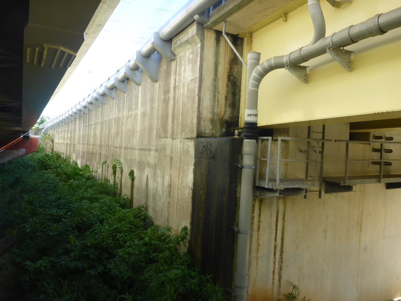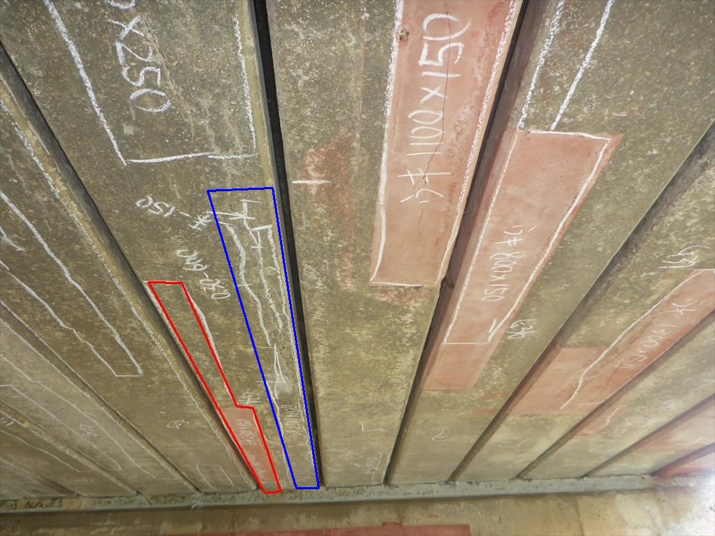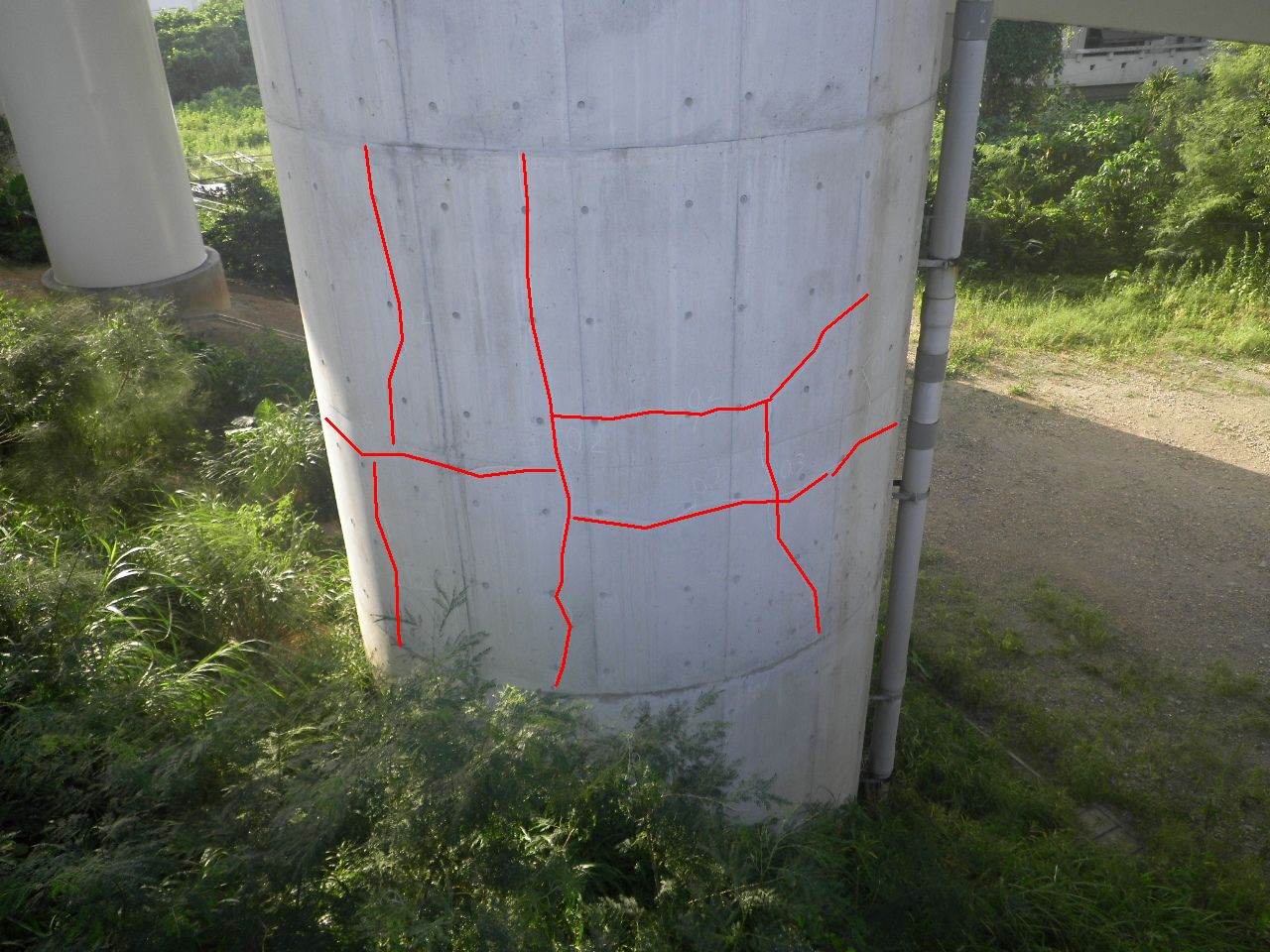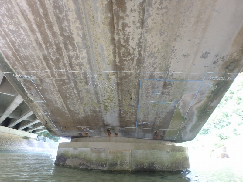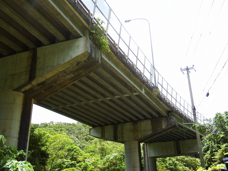 崎間 国道58号の海岸にほど近い名護市源河字後原にあるPC橋です。1982年に供用しましたが、1992年の時点で鉄筋位置の塩化物イオン量が4.42kg/㎥に達し、錆汁やひび割れを生じていたため表面保護や断面修復、床版防水などを行いました。その後は小康を得ていましたが、2007年の定期点検で、海側の主桁や内側主桁に塩害と推定されるひび割れや浮き、鉄筋露出が生じていました。2009年の詳細点検の結果、一部の桁でPC鋼線の破断(ぼろぼろでコンクリートと一緒に剥落する状態)、スターラップの破断、塩化物イオン量がPC鋼線位置で約1.2~1.4kg/㎥と発錆限界値に達していたことから架替の詳細設計を行うとともに架け替えまでは断面補修などにより延命策を採っています。