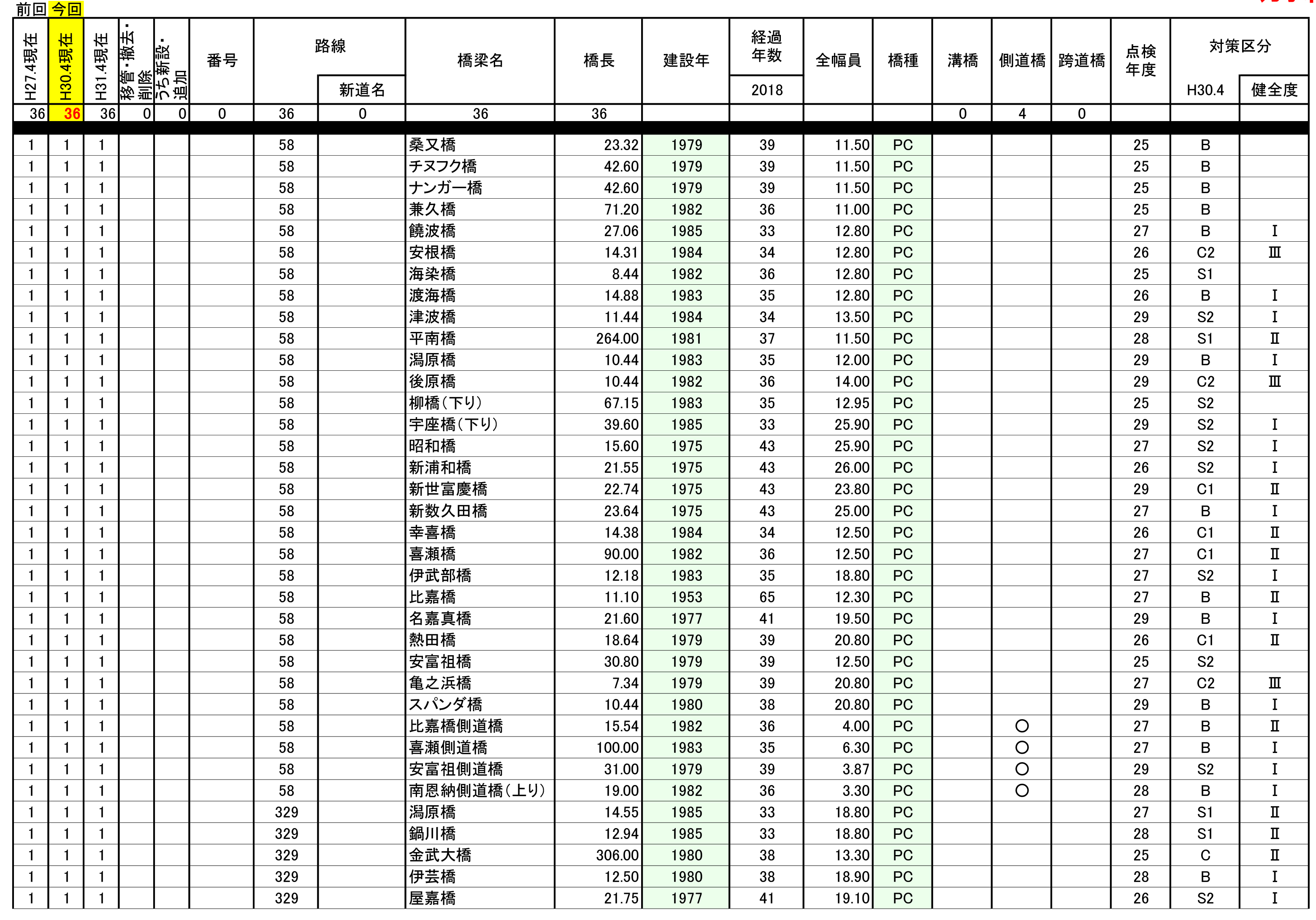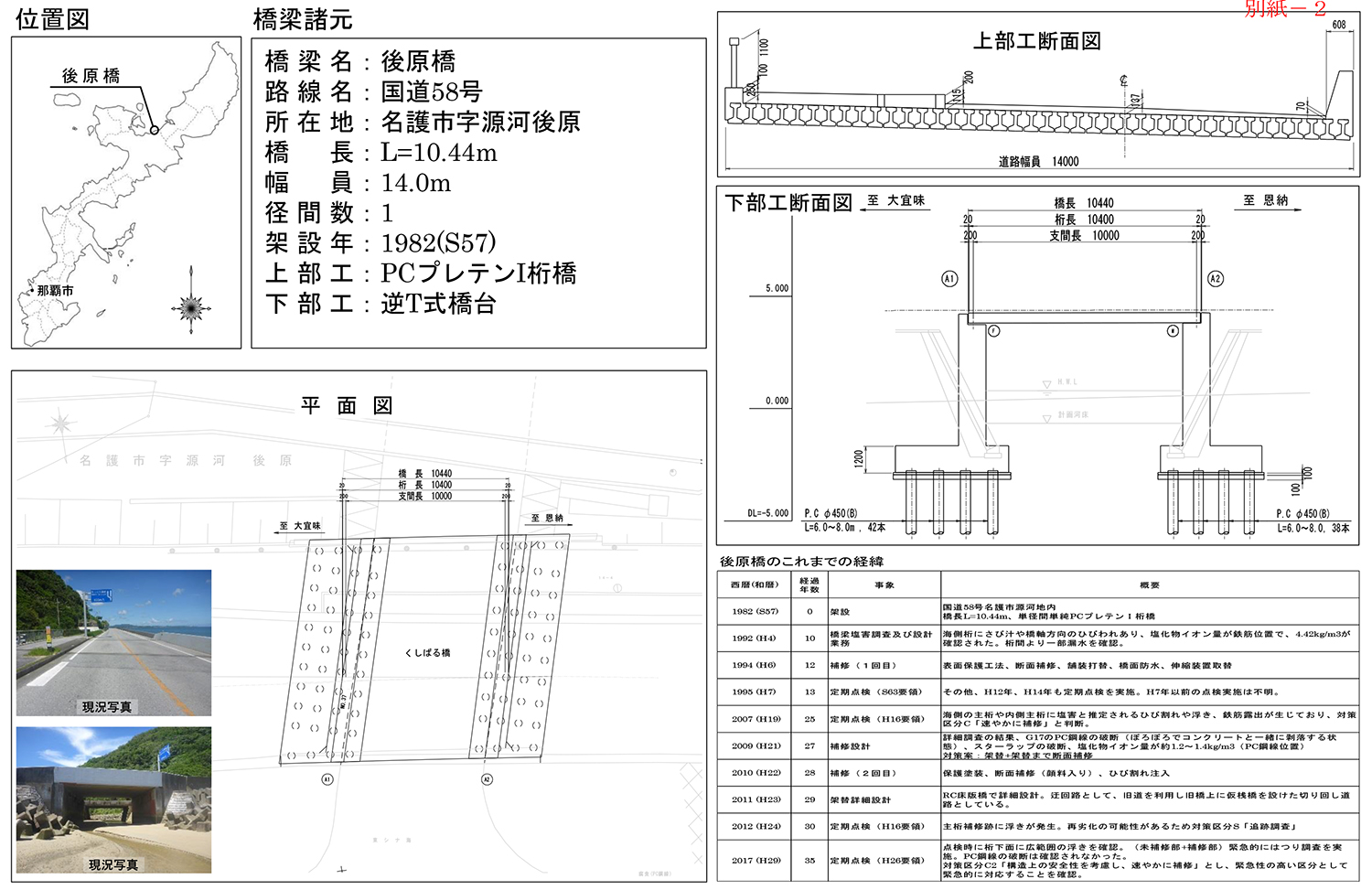 2019年度以降は6橋で対策を予定しており、うち国道58号後原橋(橋長10.4m、幅員14m、PC単純プレテンI桁)については架け替えを行う予定です。