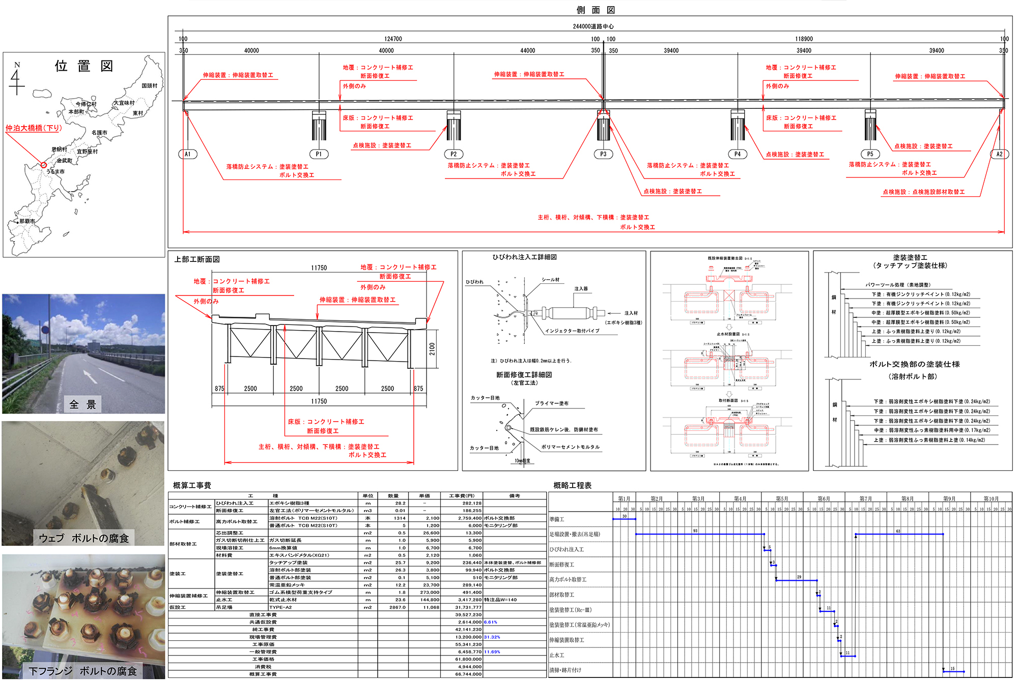 仲泊大橋は、添接部や端部の鋼材や高力ボルトの腐食、RC床版のひび割れなどの損傷が生じています。そのため、塗装の塗り替えや部分塗替え、高力ボルトの交換、床版の断面修復、ひび割れ注入、伸縮装置の交換などを行います。