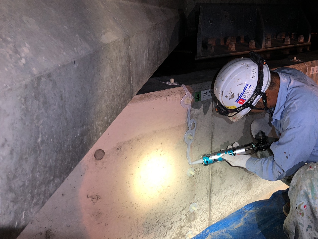 崎間 2018年度は仲泊大橋と喜瀬橋で埋設型ジョイントの取替を行いました。2019年度は東寺川橋下り線のA1、P1、A2で低摩擦密閉ゴム支承版支承の取替、山田川橋下り線でP1上の荷重支持型鋼製ジョイントの取替、平南橋の歩道部で埋設型ジョイントの取替を行います。