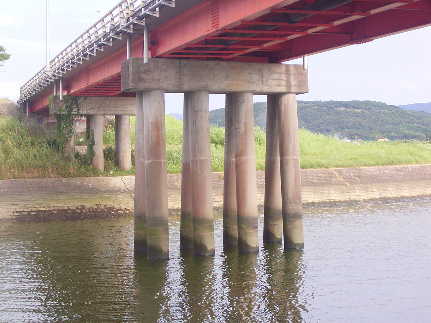 橘木 基本は耐震補強で、あわせて歩道設置も行います。須崎橋はパイルベント橋脚(右写真)となっており巻き立てを行うと、現在基準の河積を侵してしまうことになるため架け替えを選択したものです。