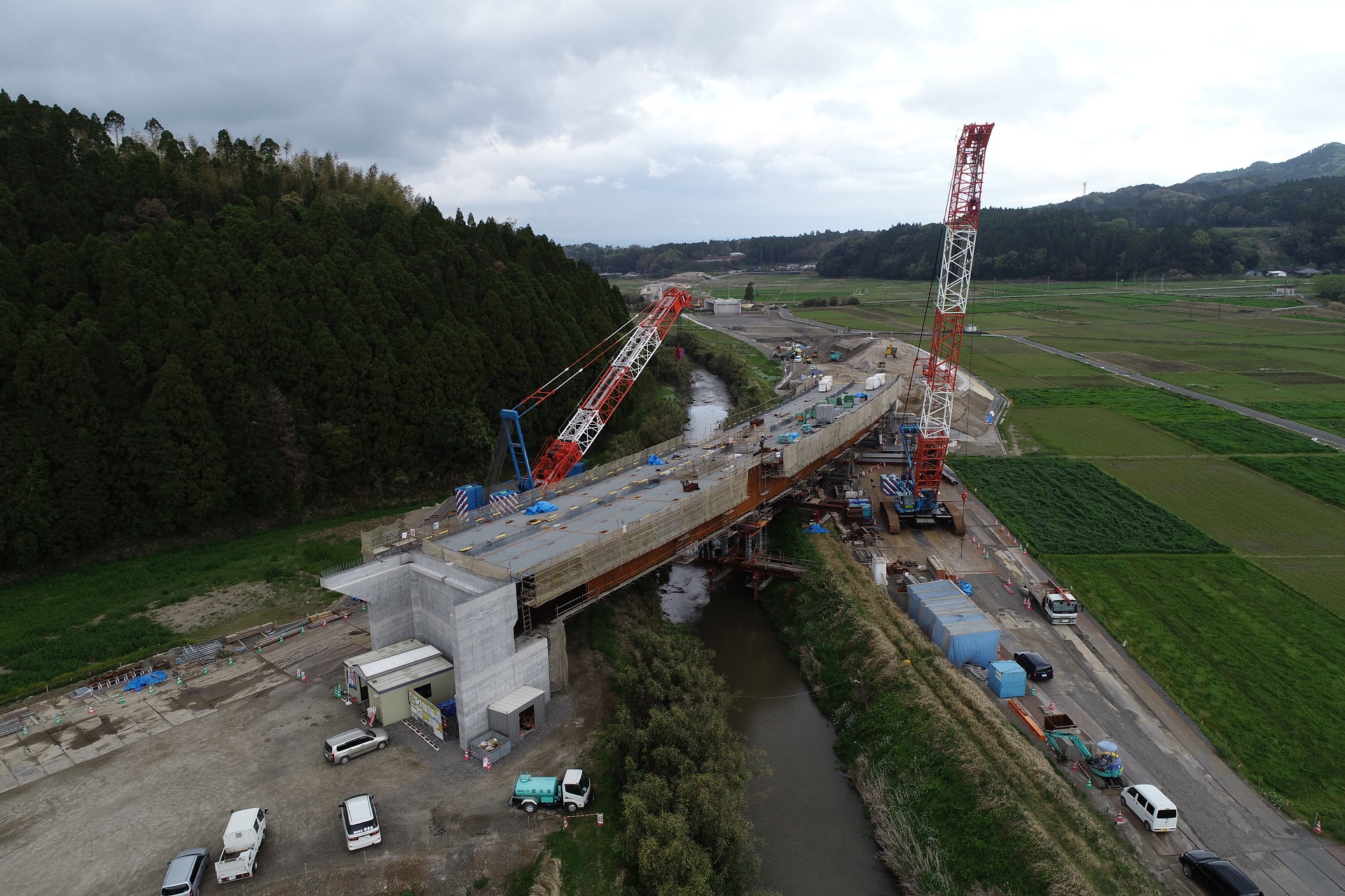 島田 広瀬大橋(橋長191m)は3つの区間に分割して工事を進めており、中央径間(渡河部、PC単純箱桁)は上部工が完成しています。側径間の上部工を工事中で、下部工はすべて完了しています。