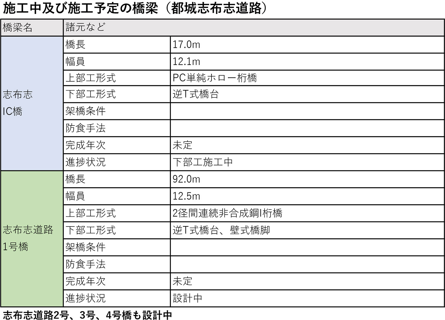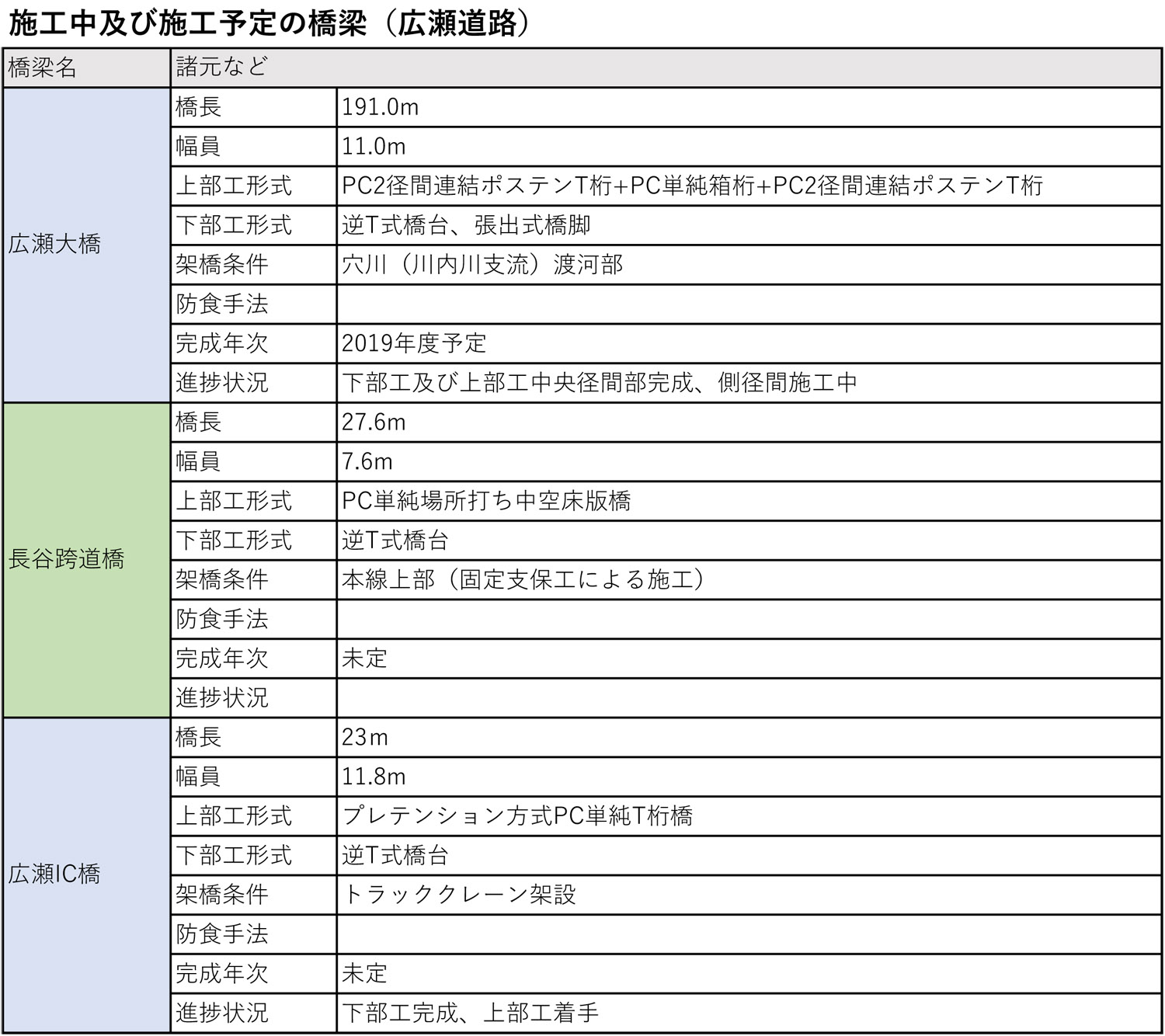 長谷跨道橋(橋長27.6m)は未着手、広瀬IC橋は下部工完成しています。