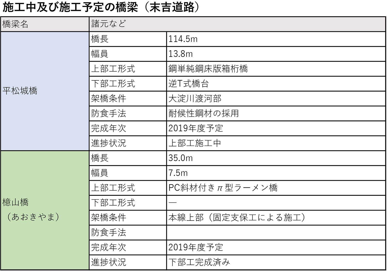 島田 橋梁が5橋で、構造物比率は9%となります。本線橋2橋と跨道橋3橋です。本線橋の平松城橋は上部工製作中で、架設は2019年度内となります。橋野橋は完成しています。跨道橋3橋のうち、2橋が上部工施工中で、1橋が設計済みで2019年度着手予定です。