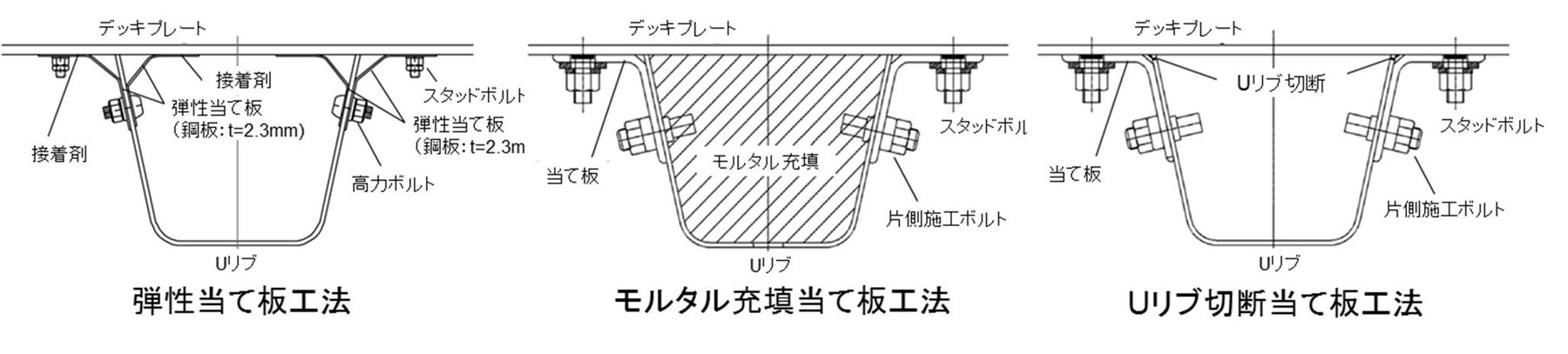 谷口 基本的に、Uリブとデッキプレートの接合部に当て板を設置して補強を行いますが、具体的には①Uリブの外面に当て板を設置した後、Uリブ内にモルタルを充填する工法、②Uリブとデッキプレートの溶接部を切断し、新たに設置する当て板を介してUリブとデッキプレートをボルト接合する工法、③Uリブ溶接部近傍に薄鋼板を接着剤にて接合する工法の3工法で、それぞれ試験施工で評価しているところです。その結果もふまえて、下面からの工法を必要に応じて使用していくことになると思います。