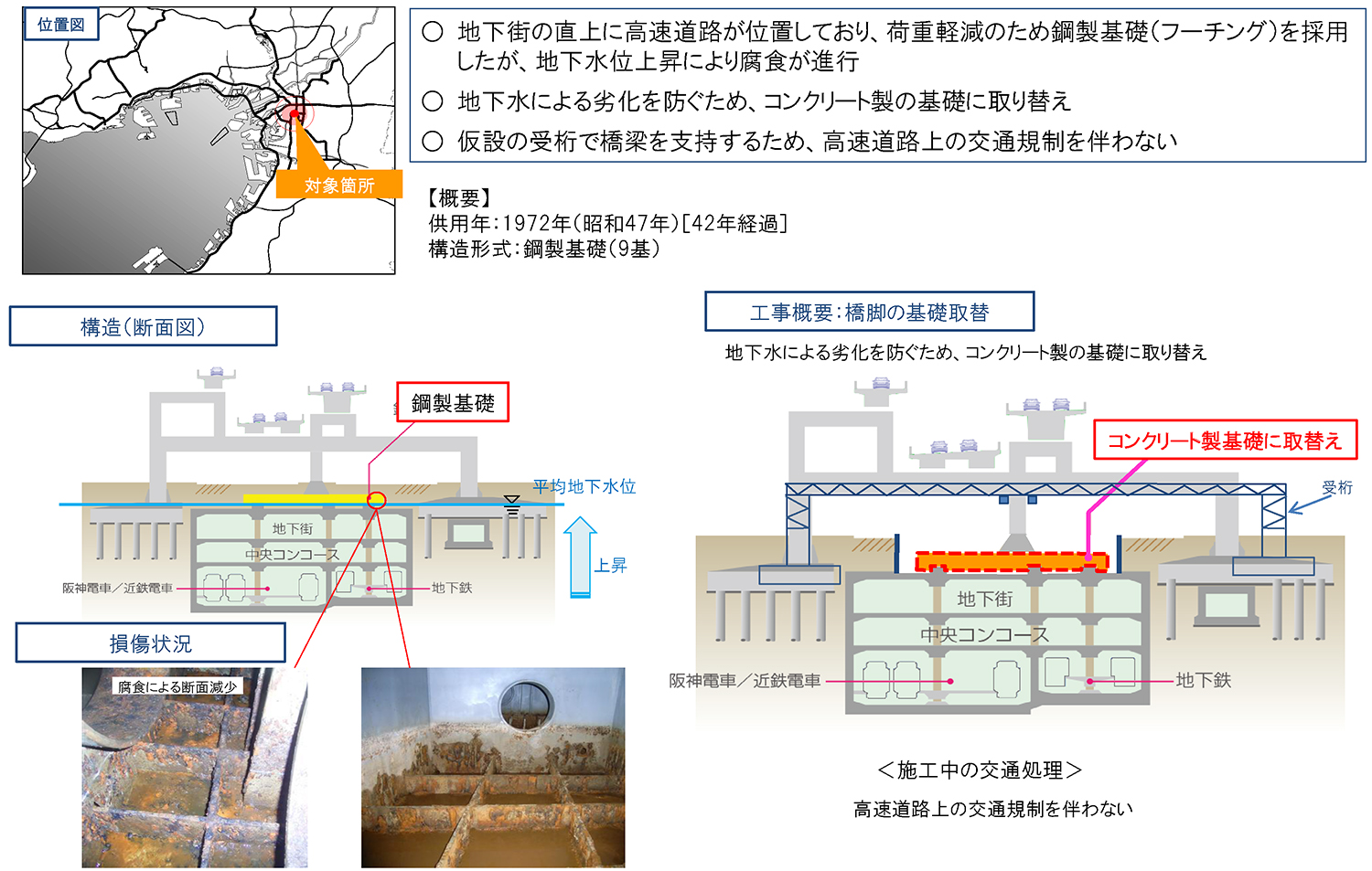 仲 同区間の構造物は1972年に供用され、47年が経過しています。地下街の構造物に支持されることから軽量化を図るため鋼製フーチングを7橋脚9基で採用していました。しかし、地下水位上昇により鋼製フーチングの腐食が進行していることから事業の対象として選定されています。技術提案交渉方式で昨年12月に契約を行い、鴻池組が受注しています。現在、詳細設計を実施しています。
