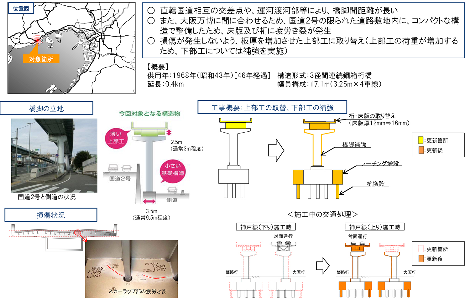 仲 支間長が長いことと、大阪万博に間に合わせるために国道2号の限られた道路敷地内に、桁高や基礎をコンパクトな構造で整備したことが疲労き裂の要因となっています。