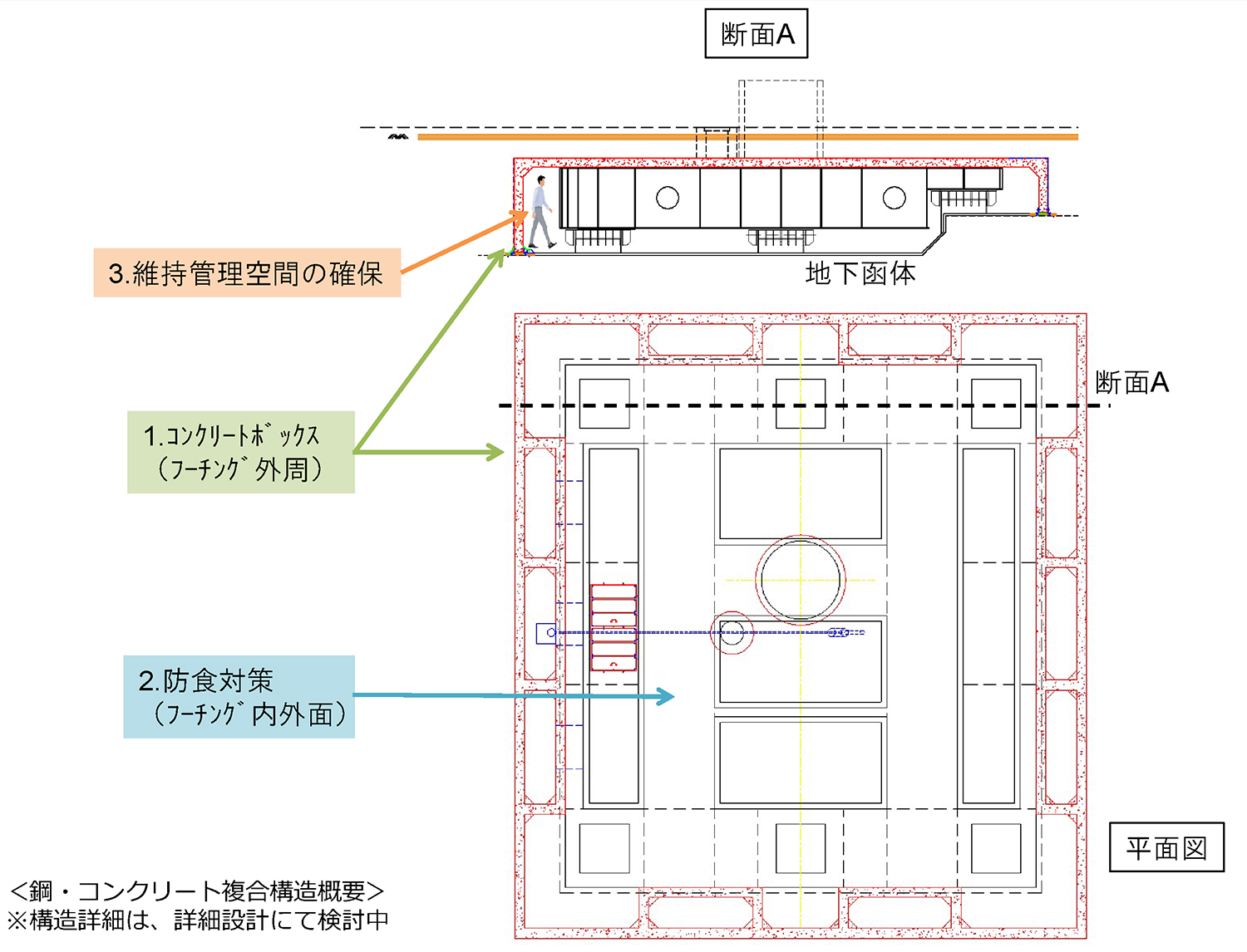 仲 地下函体のある下面を除いて新たに設置するコンクリートボックスと鋼製フーチングを一体化して、鋼コンクリートの複合構造物を新たなフーチングにします。