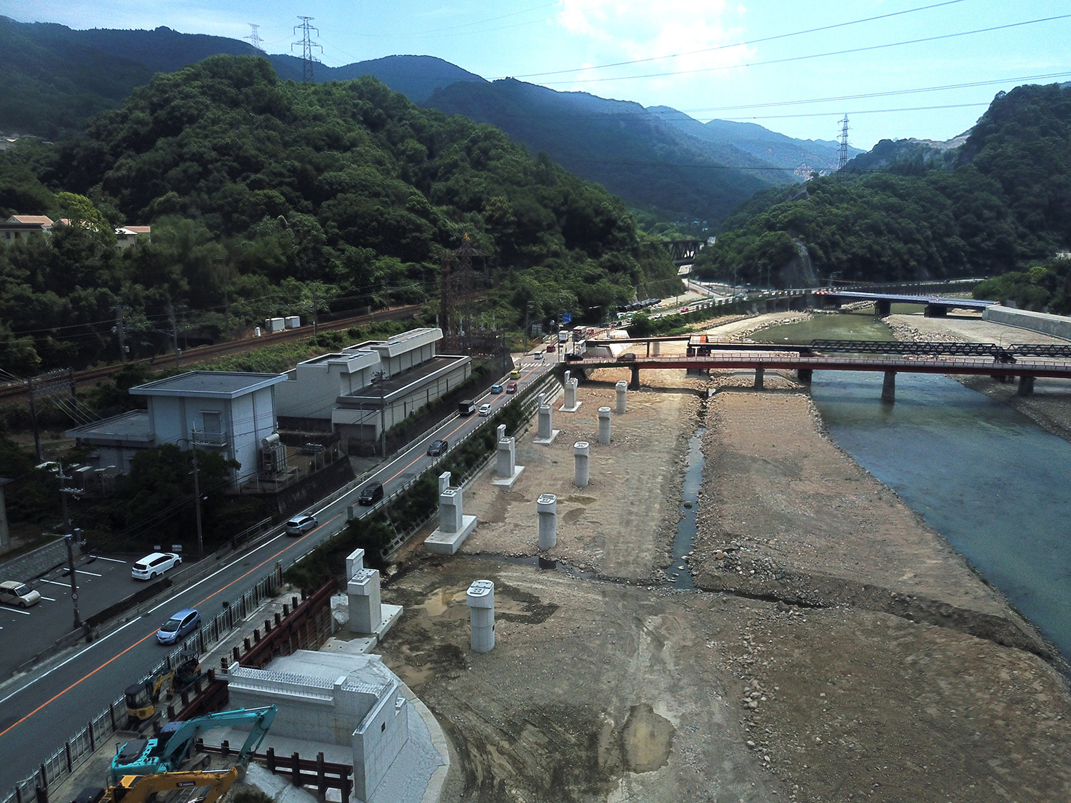 国道483号豊岡道路では細見川橋(橋長70m、PC2径間連続箱桁橋)の下部工1基ほか1件、国道9号笠波峠除雪拡幅事業では、作山川橋(橋長17.5m、高強度プレテンション方式PC単純床版橋)の下部工2基、湖西道路では天神川橋(橋長177.6m、鋼5径間連続合成少数鈑桁橋)の下部工1基、清滝生駒道路では、下田原跨道橋(87m、鋼2径間連続合成鈑桁橋)の上部工と高山高架橋(橋長257.5m、PC5径間連続箱桁橋)の下部工2基、寺田拡幅では、寺田跨線橋(橋長340m、鋼7径間連続非合成鈑桁橋)の下部工2基を施工中です。