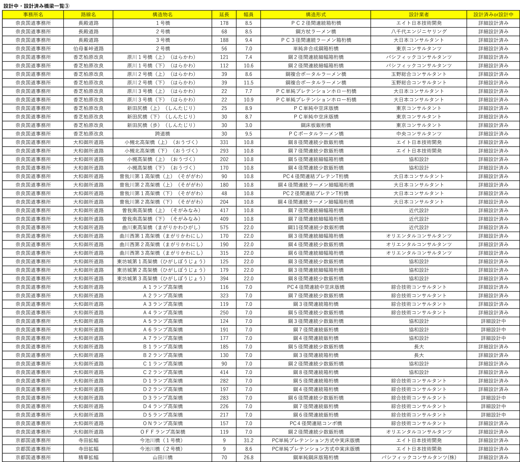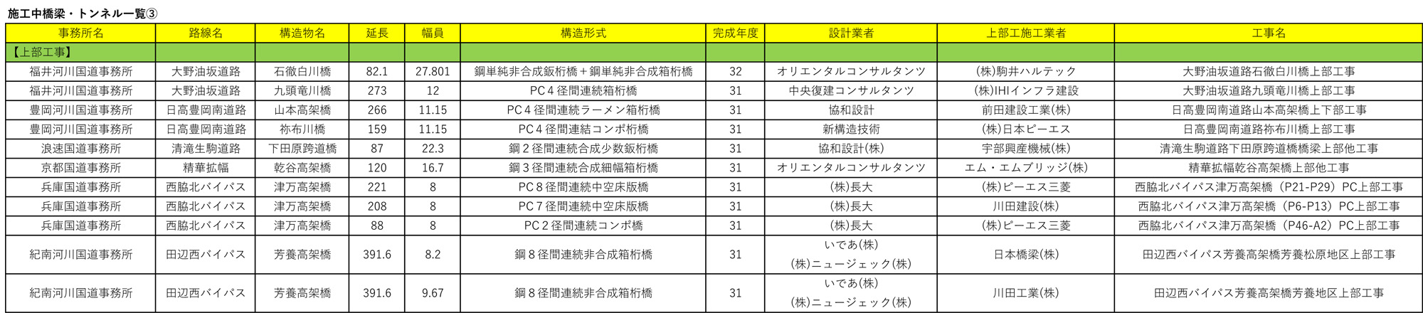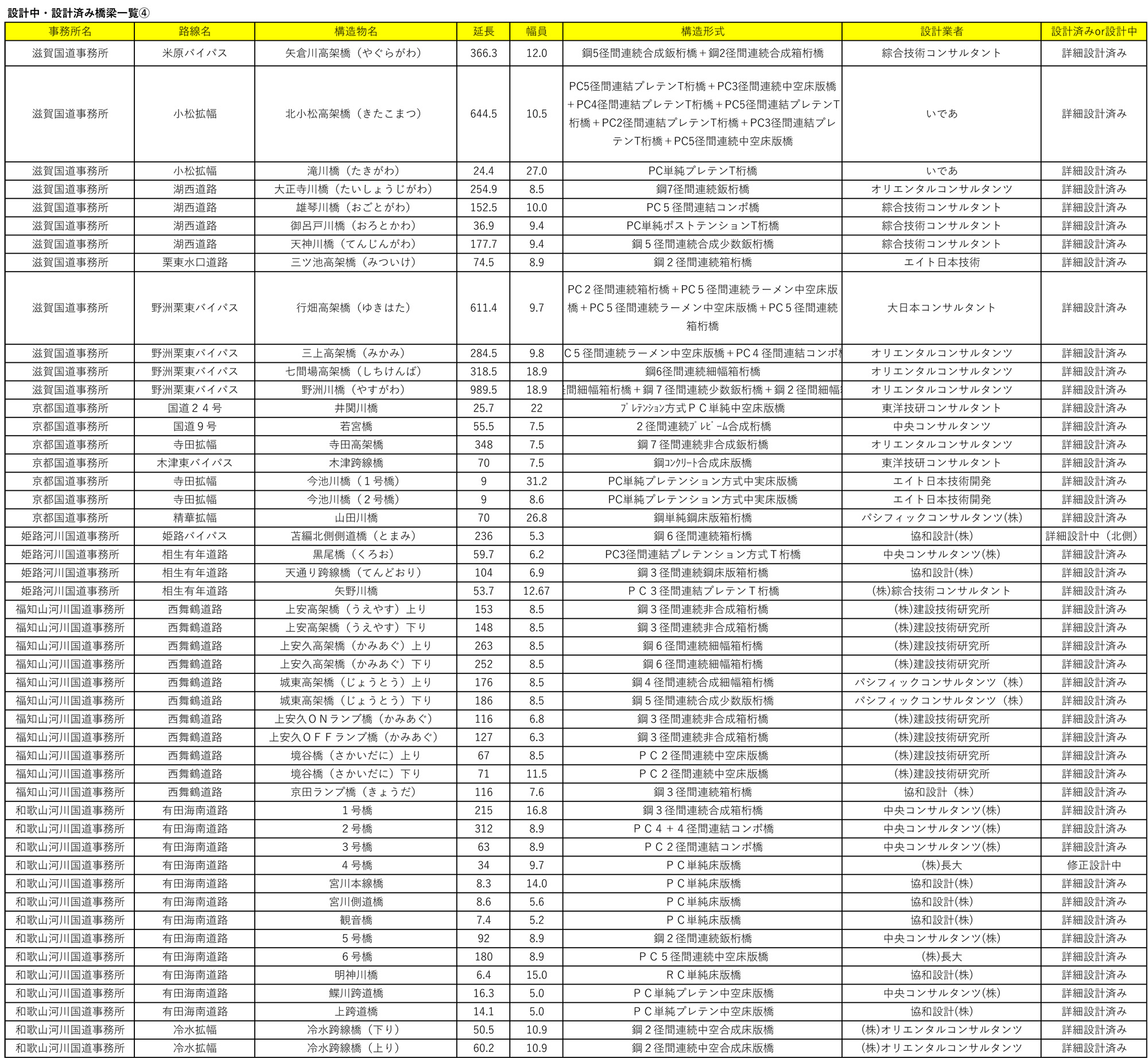 橋梁は、国道161号湖西道路大正寺川橋(橋長255m、鋼7径間連続鈑桁橋)、国道175号西脇北バイパス津万高架橋(P29-P41、延長346m、PC6+6径間連続ポステンホロー桁)、国道24号寺田拡幅寺田高架橋(橋長340m、鋼7径間連続非合成鈑桁橋)、国道42号有田海南道路1号橋(橋長215m、鋼3径間連続合成箱桁橋)、国道158号大野油阪道路新子馬巣谷橋(橋長206m、鋼単純アーチ橋)、同道路此の木谷橋(橋長168.5m、鋼2径間連続箱桁橋)など全部で23件の発注を予定しています。