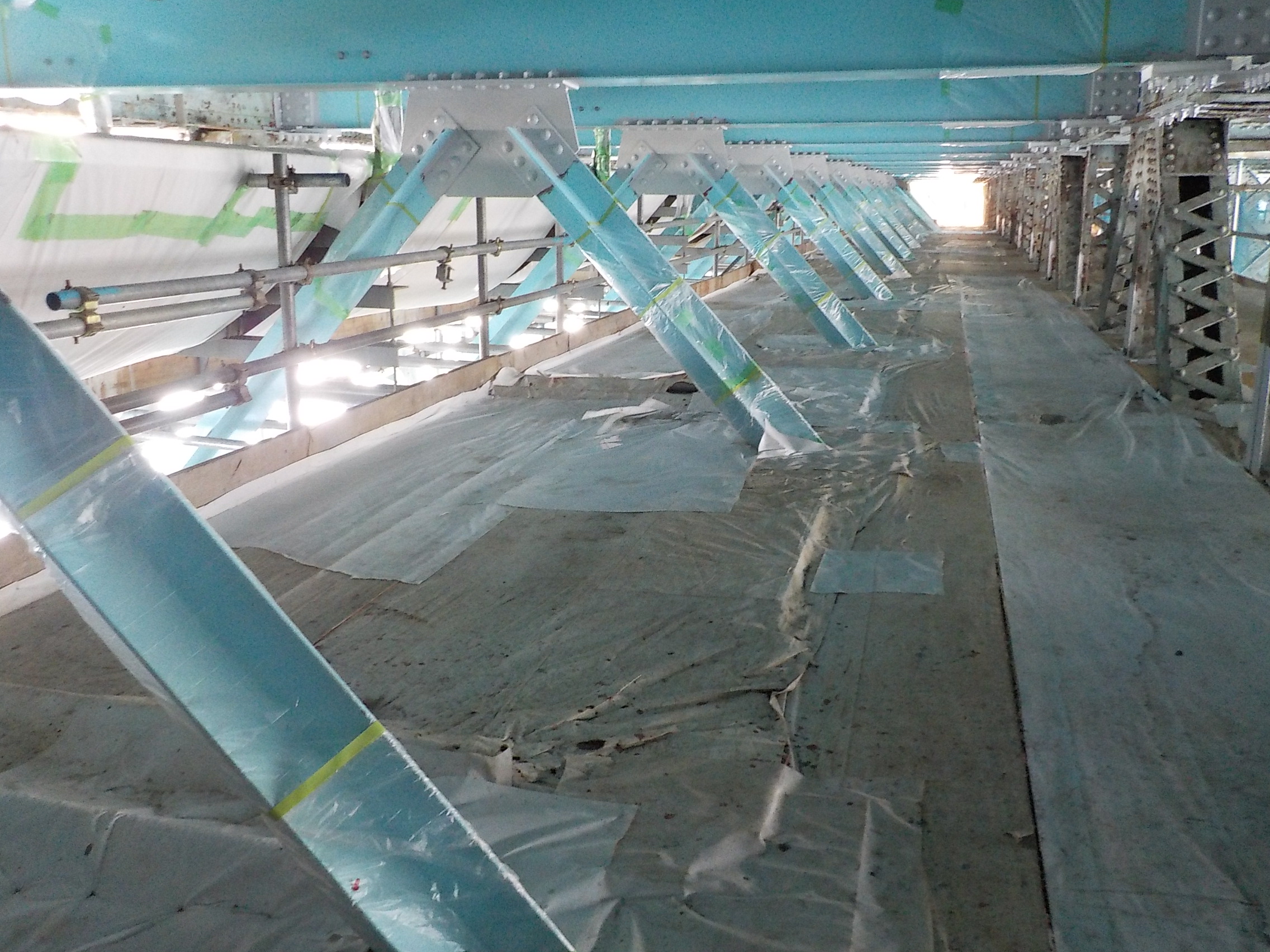 国道43号安治川橋(下)では、箱桁内の鋼床版の縦リブと横リブの溶接部に塗膜割れが多数確認されました。そのためMTなどで詳細調査を実施し、保守方法について検討していきます。