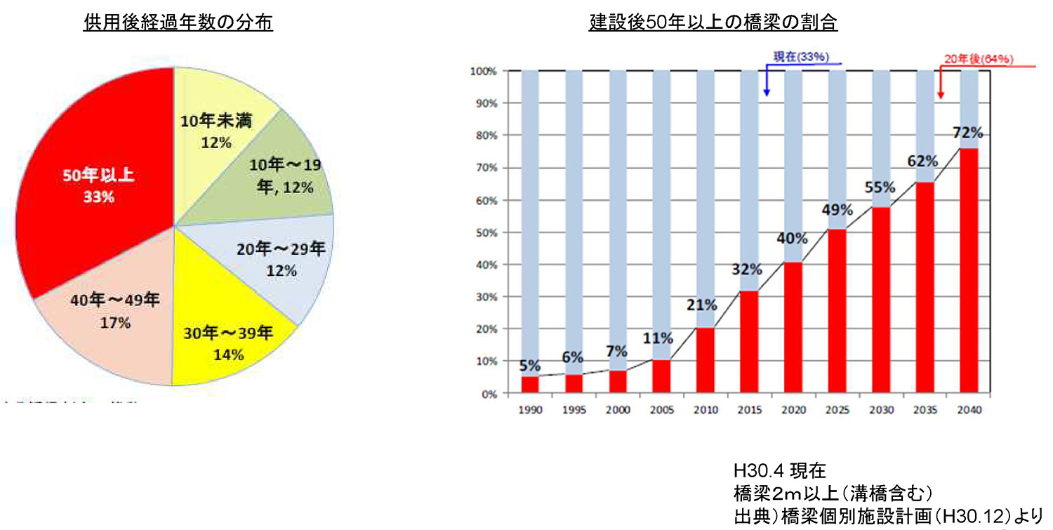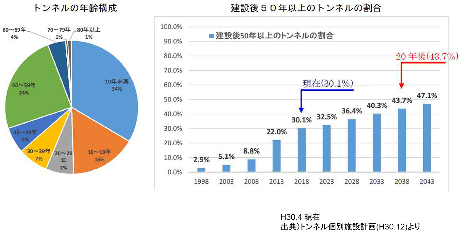 供用年次が明らかな橋梁において50年を超える橋梁数の割合は、約33%に達しており、これが20年後には約64%まで急激に増加します。50年を超えるトンネル数の割合は、現在の約30%から20年後には約44%となり、トンネルも高齢化が急速に進んでいきます。