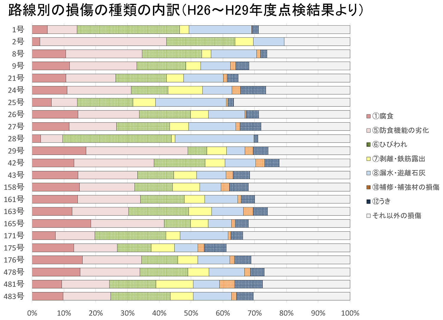 コンクリート床版における路線別の損傷種類の内訳