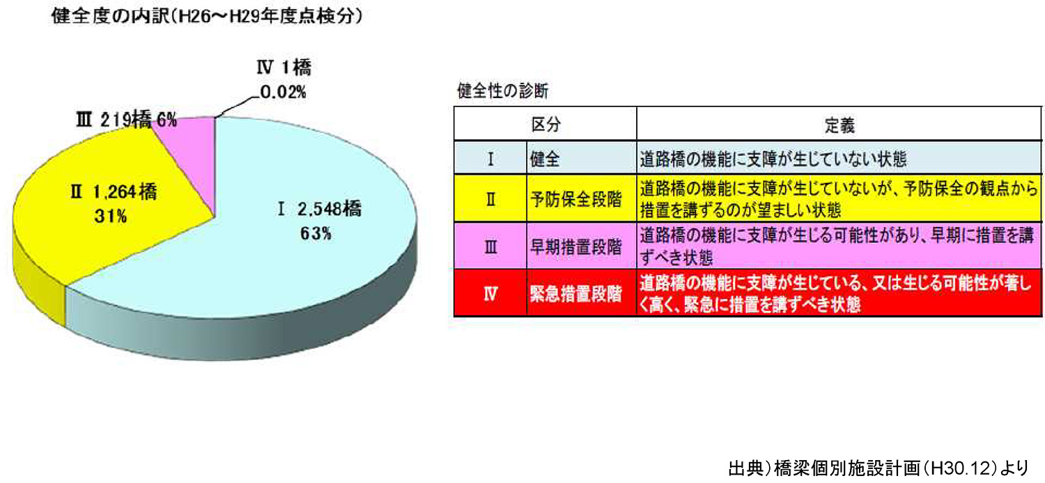 新しい橋梁点検要領により実施された2014~18年度点検における健全性の区分についてはⅠが65%、Ⅱが29%、Ⅲが6%、Ⅳが0.02%(対策済み)となっています(速報値)。