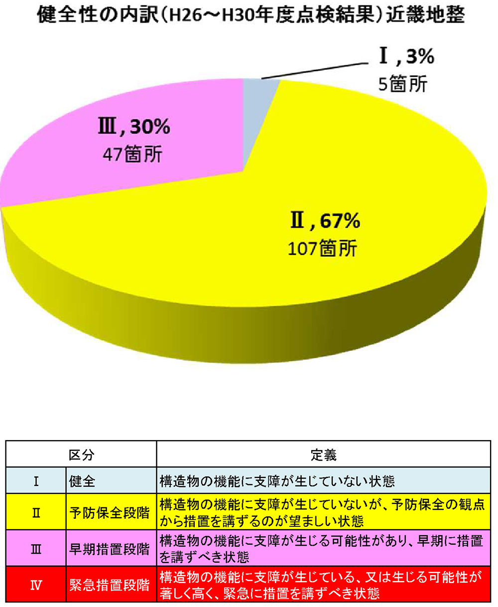 同様に新しいトンネル点検要領により実施された2014~18年度点検におけるトンネルの健全性の区分についてはⅠが3%、Ⅱが67%、Ⅲが30%、となっています(下円グラフ)。