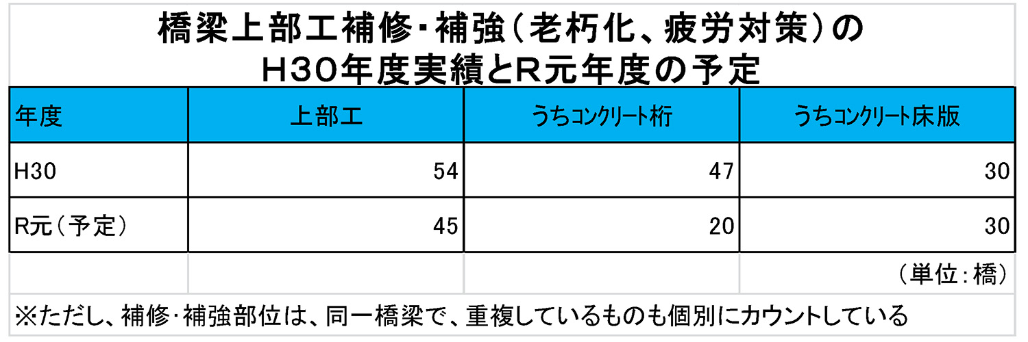 橋本 上部工補修・補強の実績は、2018年度は54橋です。うち、コンクリート桁が47橋、RC床版が30橋(桁と床版は重複あり、以下同)、2019年度は45橋の上部工を補修ないし補強する予定で、うちコンクリート桁は20橋、RC床版は30橋施工する予定です。