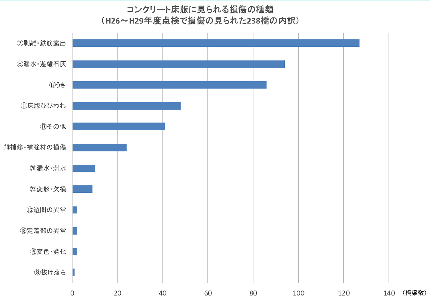 橋本 鋼橋の疲労亀裂は大型車が多い国道2号・25号・43号などで他路線よりも多く発生しています。塩害は凍結防止剤の影響が考えられる国道161号や海沿いの路線である国道42号で見られます。鋼橋形式が比較的多い2号・29号では防食機能の劣化や腐食などの損傷が生じています。コンクリート橋が比較的多い1号・28号などではひび割れや漏水・遊離石灰などの損傷が多い傾向となっています。