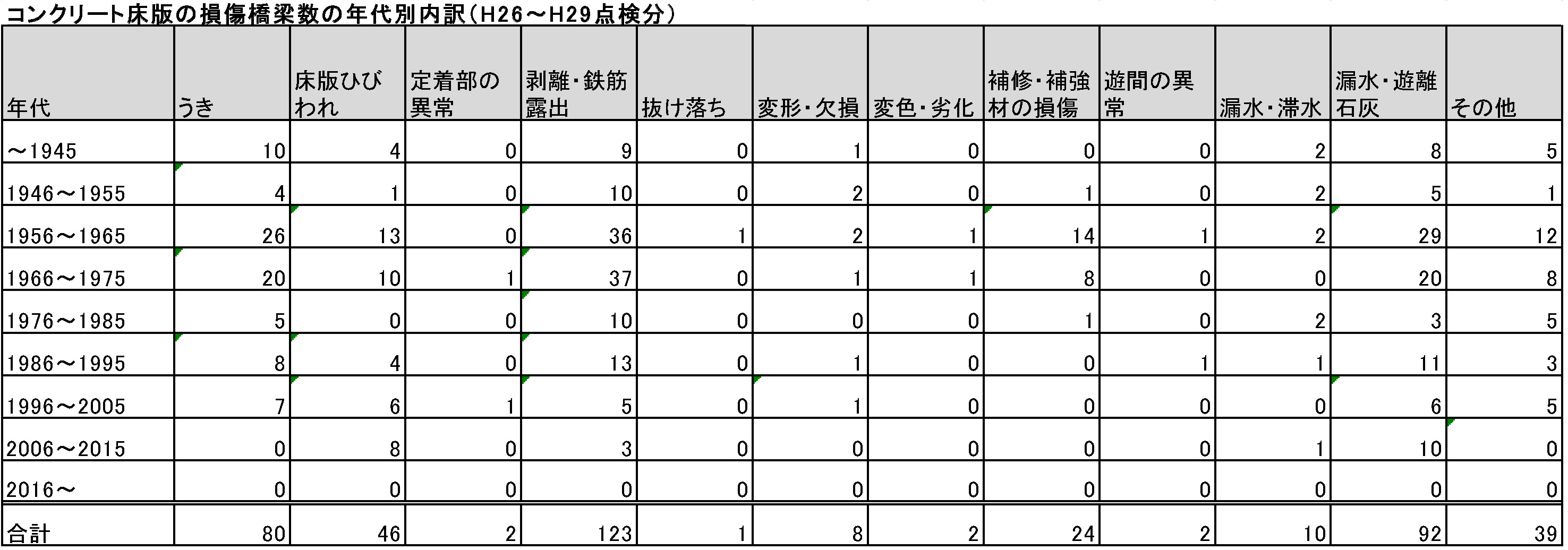 コンクリート床版における供用年次別の損傷内訳