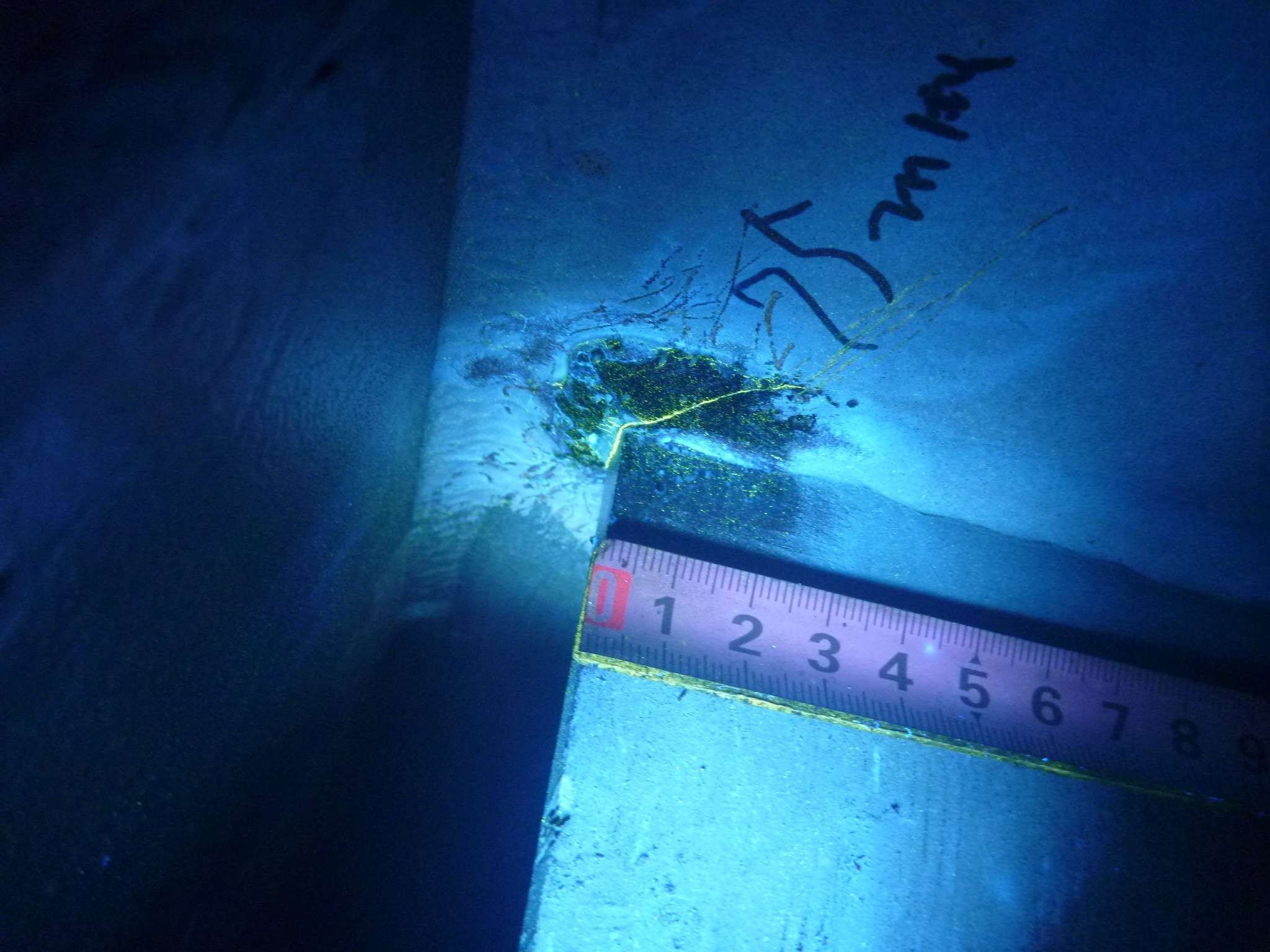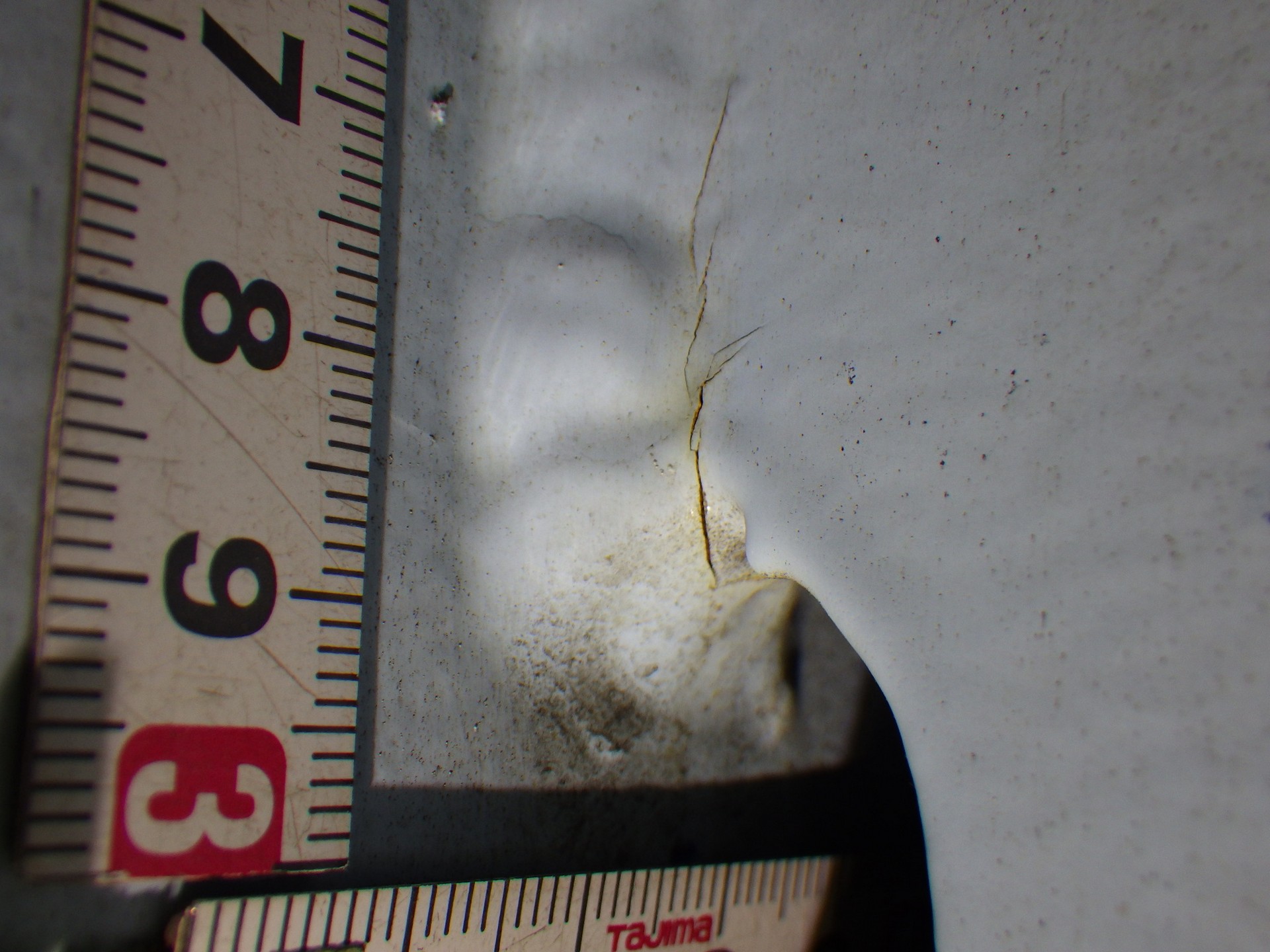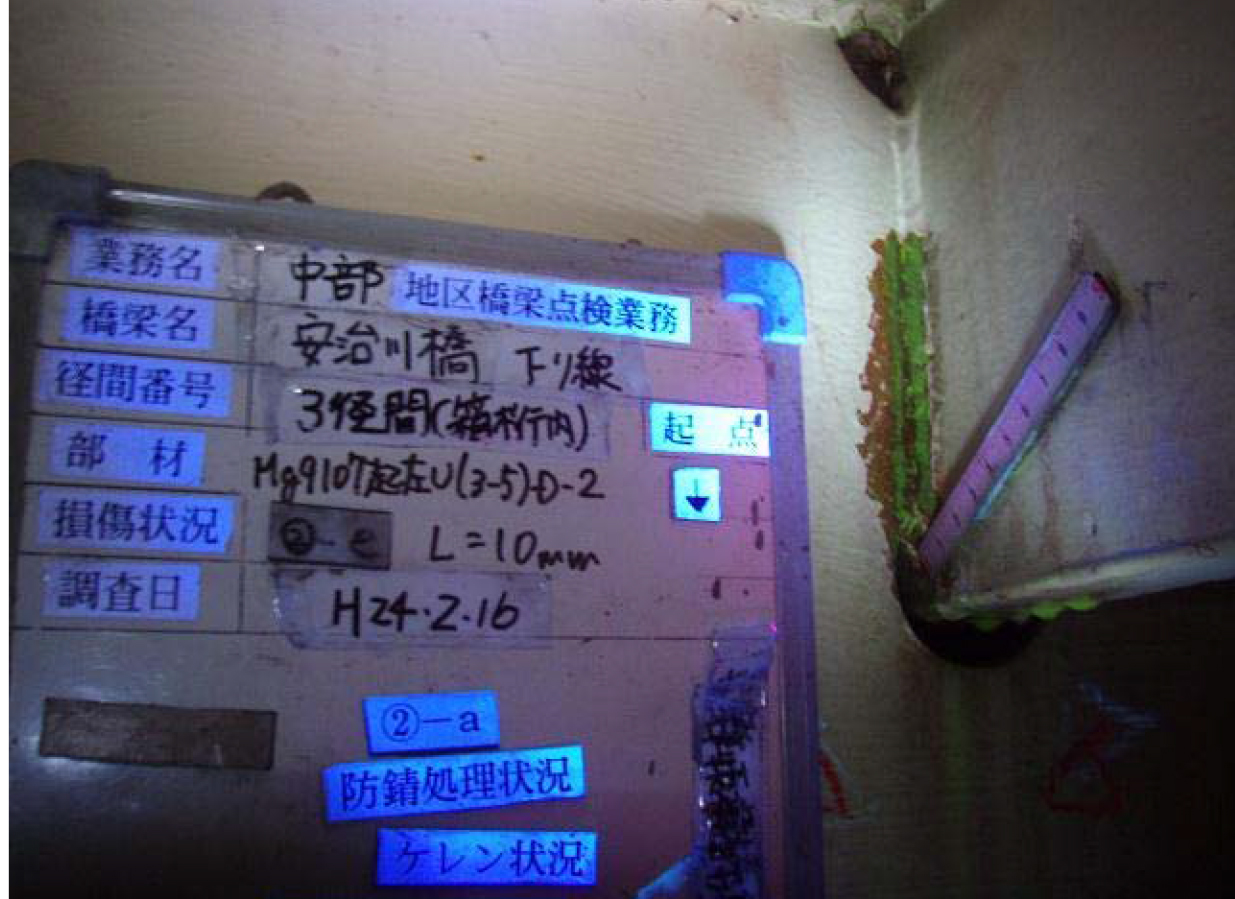 国道1号古川高架橋(下り線)では、箱桁内の主桁垂直補剛材と鋼床版との溶接ビード部から生じたと思われる塗膜割れがあり、MT調査を実施したところ長さ60㍉の亀裂が確認されました。亀裂進展の有無を追跡調査しており、進展状況に応じて垂直補剛材の剛度を小さくする半円形除去加工による補修やあて板等の補修を行います。