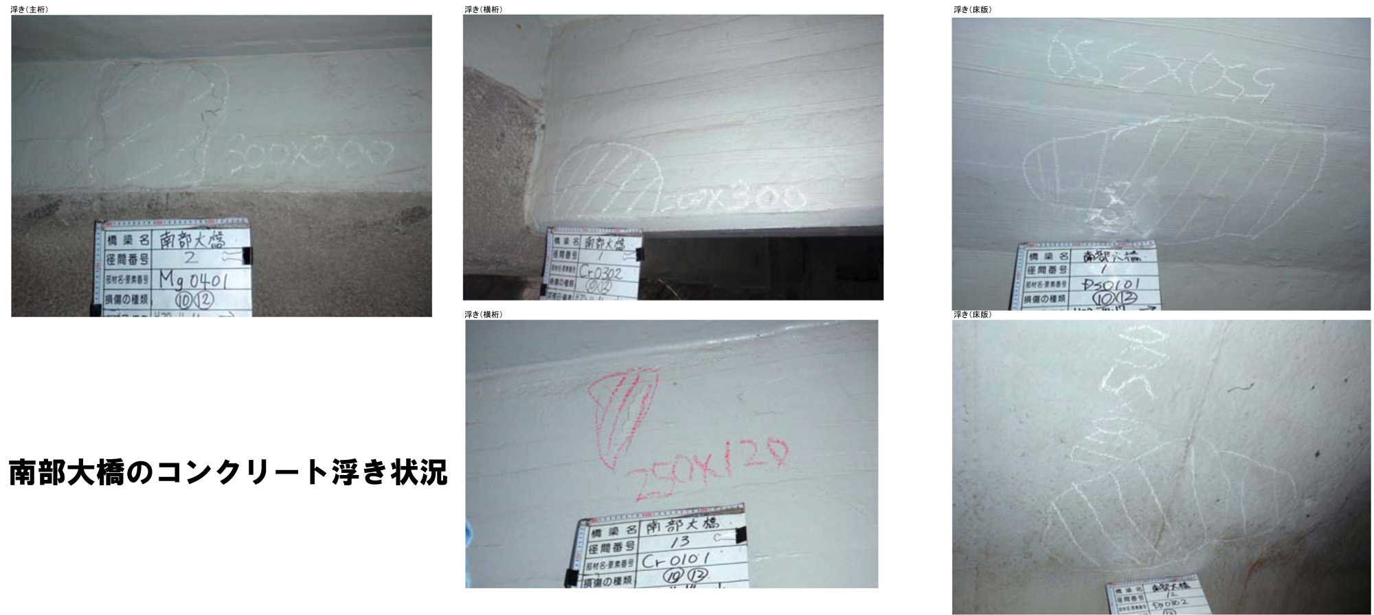 南部大橋の主桁のコンクリート剥落・鉄筋露出(左・中)、同床版の損傷(右)