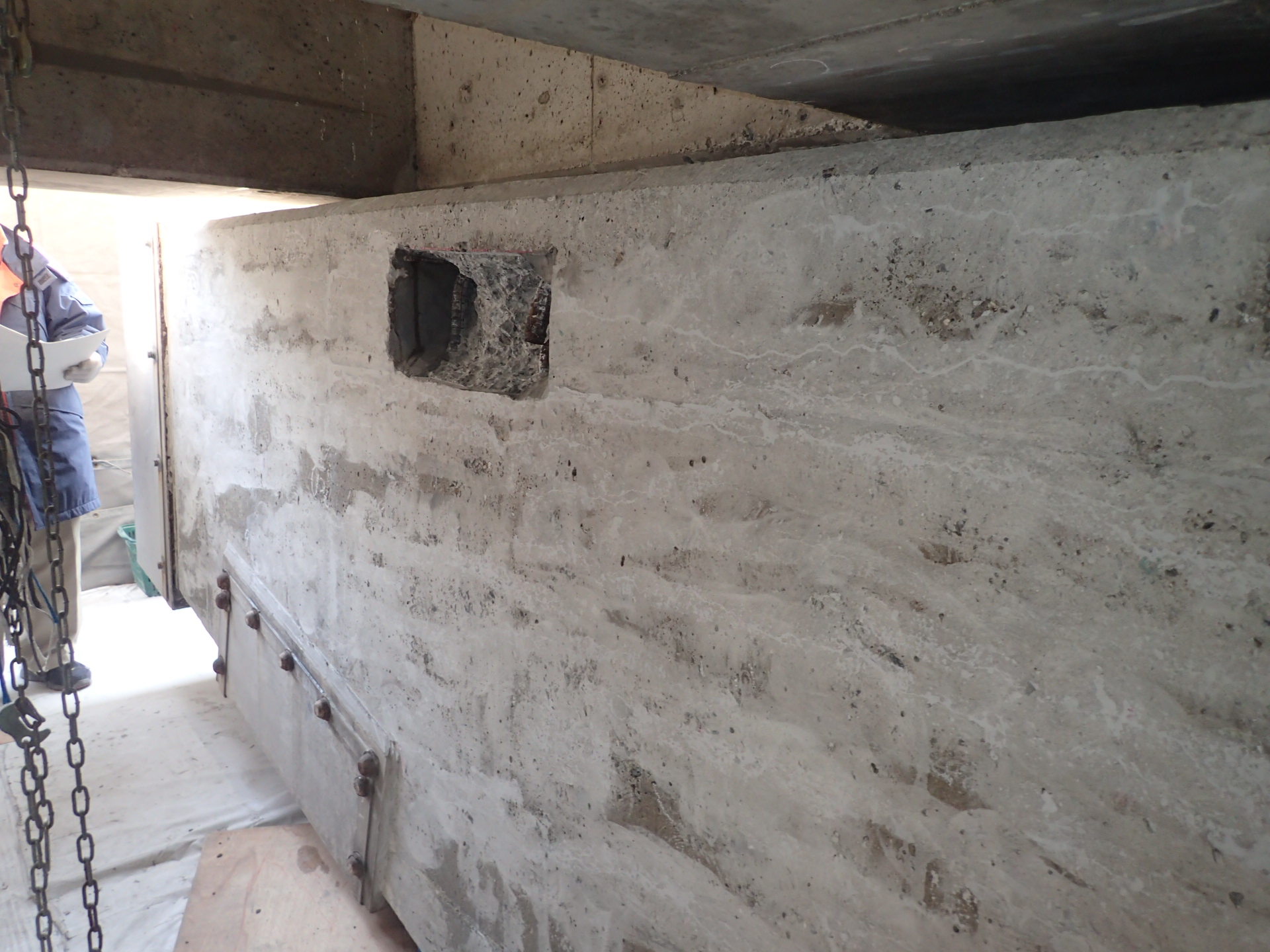 そのため、塩化物イオン量調査などを実施した上で対策工を検討し、電気防食、断面修復、ひび割れ補修等を実施しました。