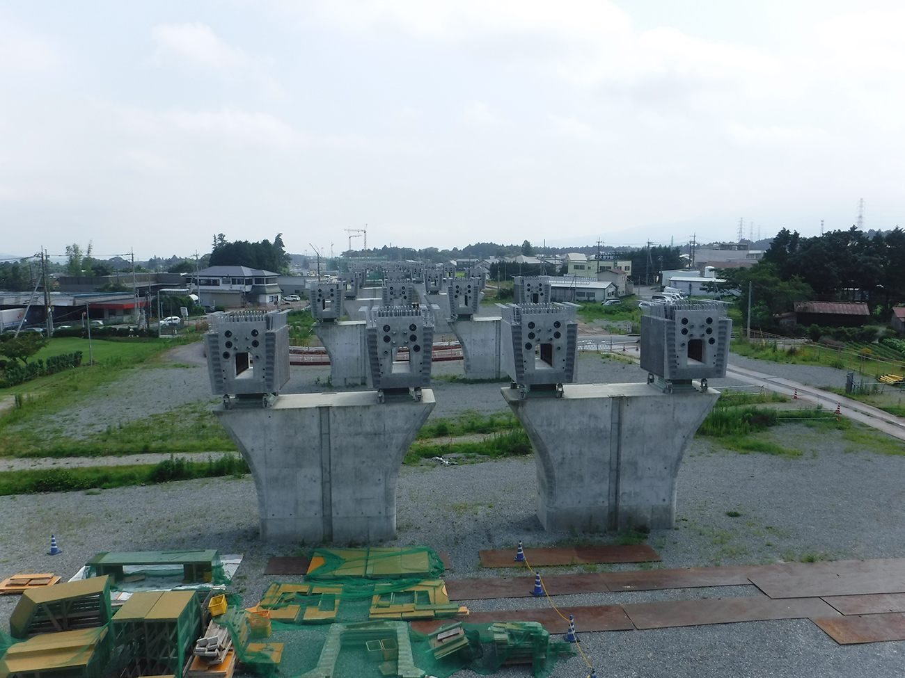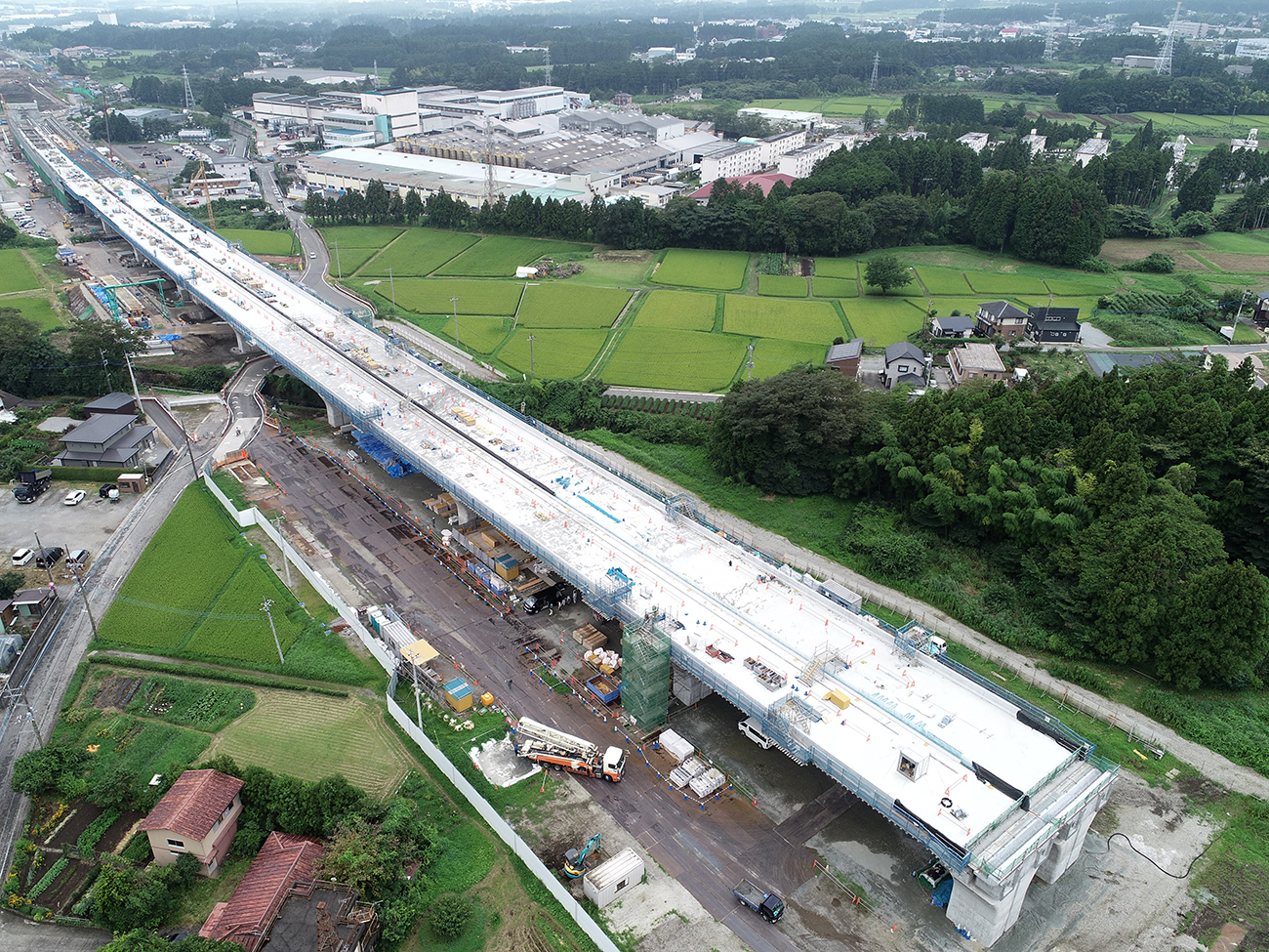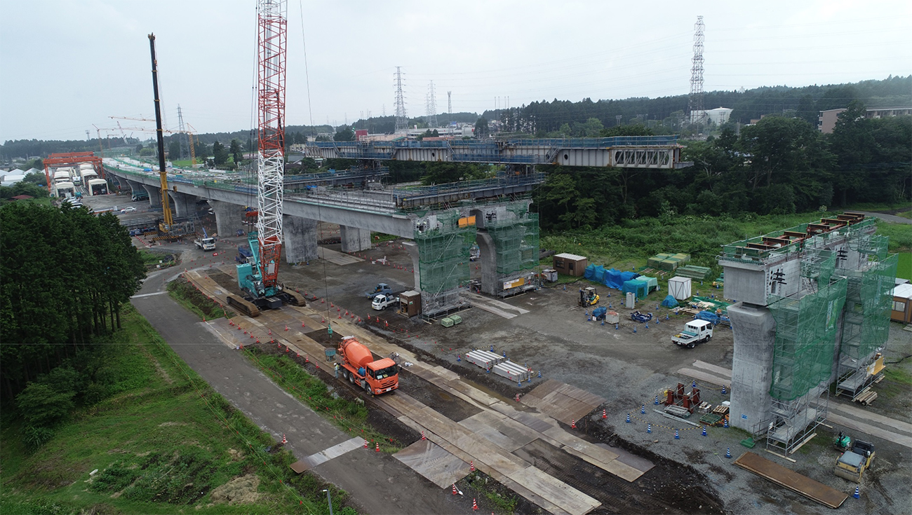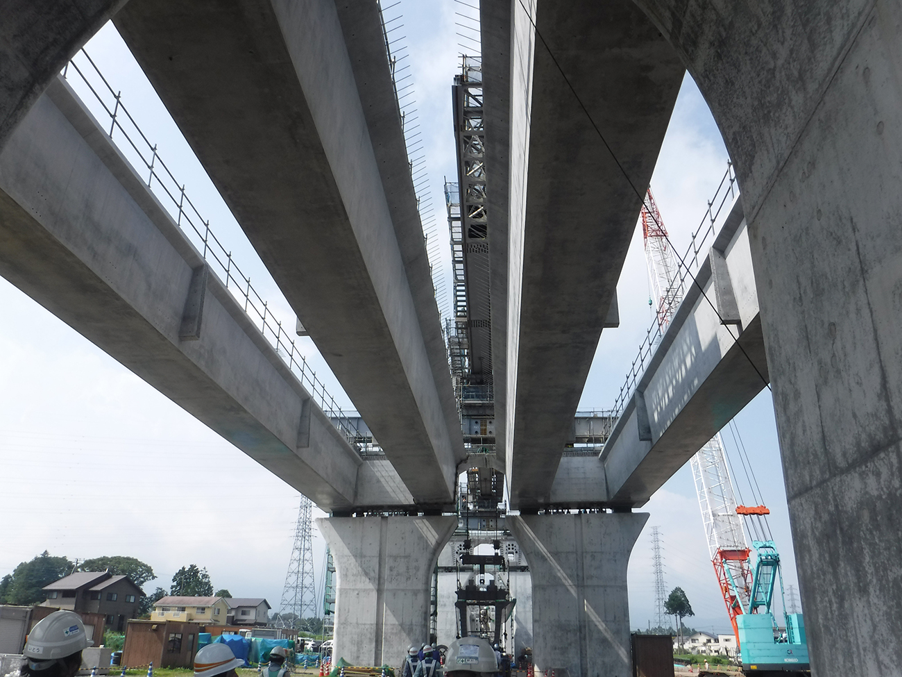 下部工はすべて完成していて、上部工は15径間のうち、上り線が15径間、下り線が14径間の架設を終えています。
