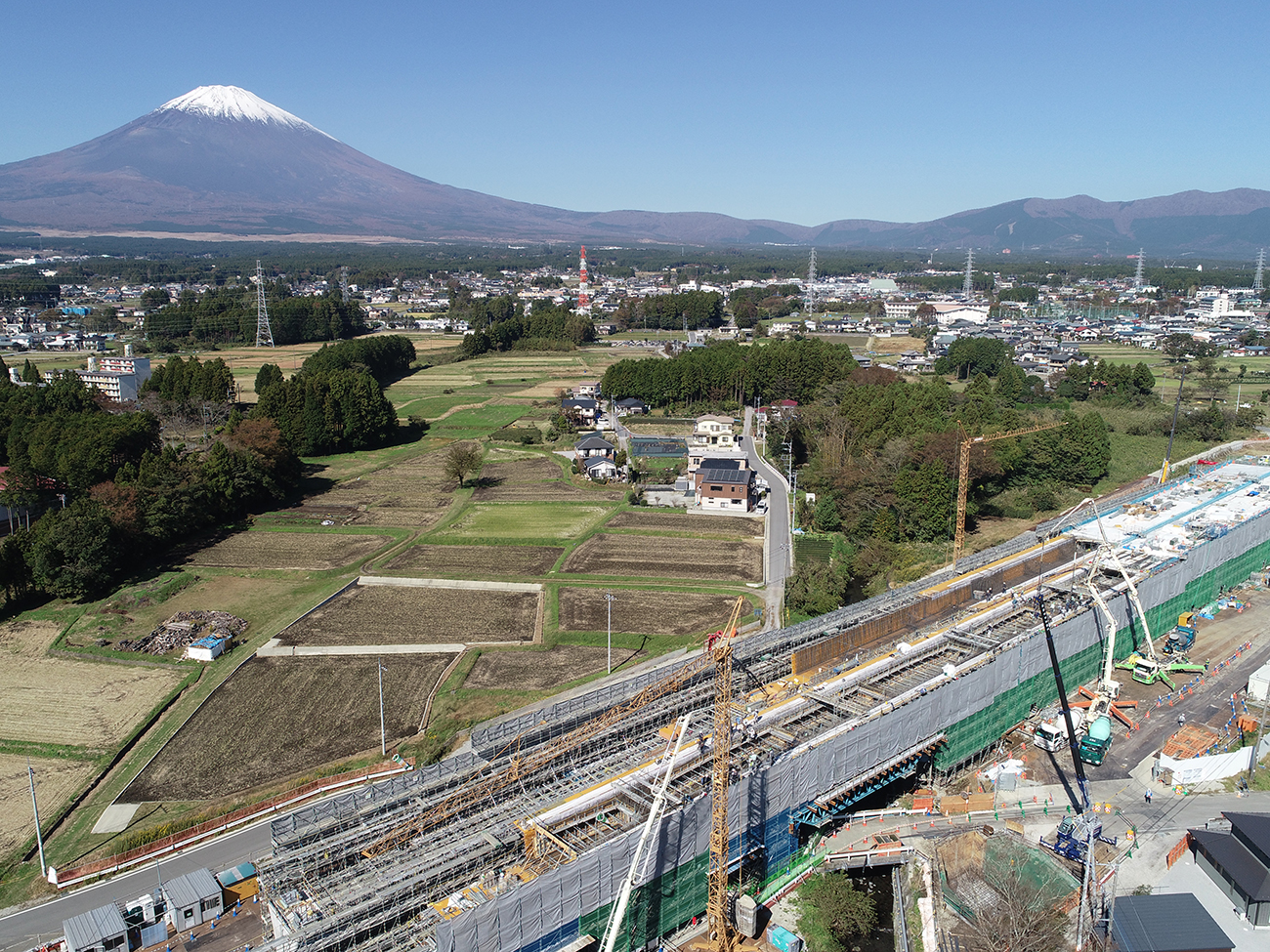 川上 全体で御殿場高架橋と称していますが、東京側から仁杉高架橋(700m)、ぐみ沢上高架橋(899m)、ぐみ沢下高架橋(951m)、杉名沢第一高架橋(852m)、杉名沢第二高架橋(750m)です。杉名沢第二高架橋は複合橋ですが、他の4橋はPC橋となっており、特徴は両側を除く3連(ぐみ沢上・下高架橋、杉名沢第一高架橋)にUコンポ橋を採用していることです。