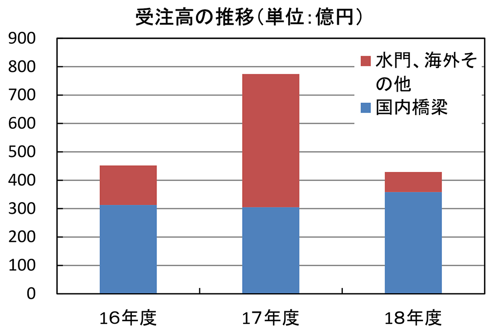 石原 売上高は橋梁部門が前年度比17%増となったが、全体としては海外事業の売上高割合が大きかった17年度を除いてほぼ例年並みの水準となった。経常利益は47億円で過去最高益となり、経営面における改善の取り組みが業績に反映されたものとみている。