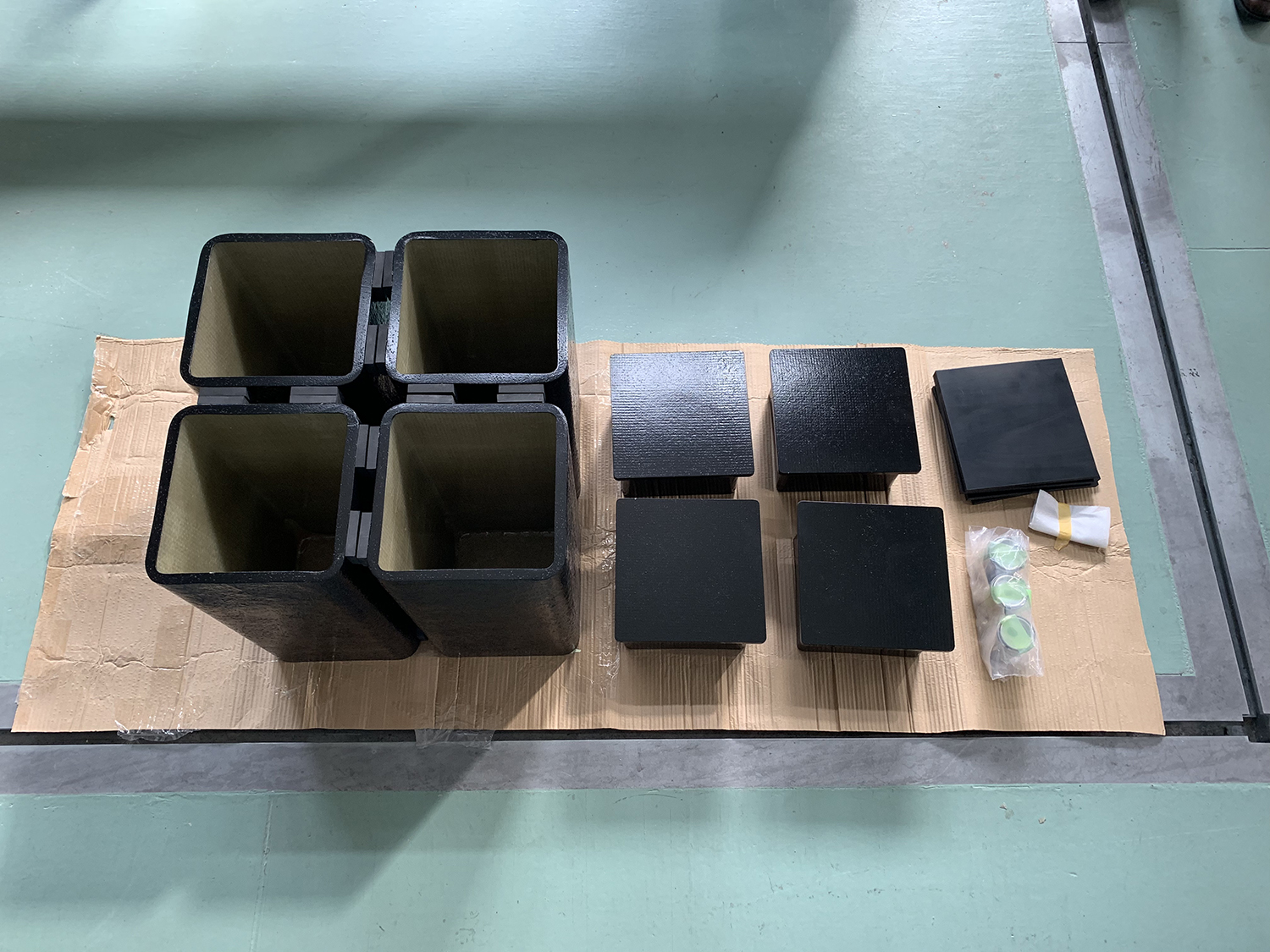 里深 現場での施工性などを考慮し、軽い材料を使うことを考慮し、箱にはGFRPを採用し、板厚も10mm程度としました。200×200mmの正方形とし、高さは400mm、これを九州縦貫道木山川橋の桁脱落(熊本地震)などの教訓を考慮し、4つ並べてサイコロ型に設置して運用しようと考えています。箱内には珪砂を詰めます。珪砂は全高詰めるのではなく、350mm程度とし、隙間をわざと開けます。その上には厚さ100mm程度のGFRP製の落し蓋(箱体との間にも隙間をわざと空ける)を設置する構造とします。すると支承が壊れて桁が落ちたときも落し蓋に荷重がまず乗り、その落し蓋から珪砂に荷重をかけることで、珪砂が横方向に広がり、GPRP版に膜応力(均一な引張力)をかけて支えるというものです。