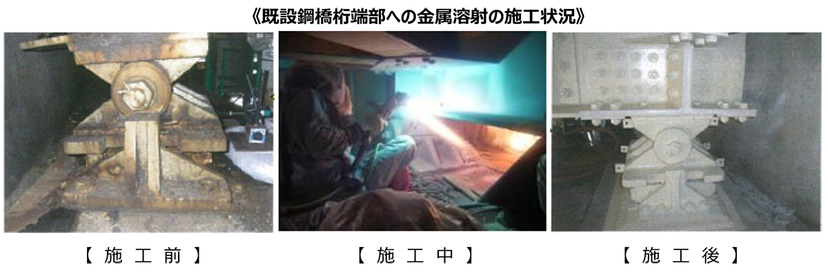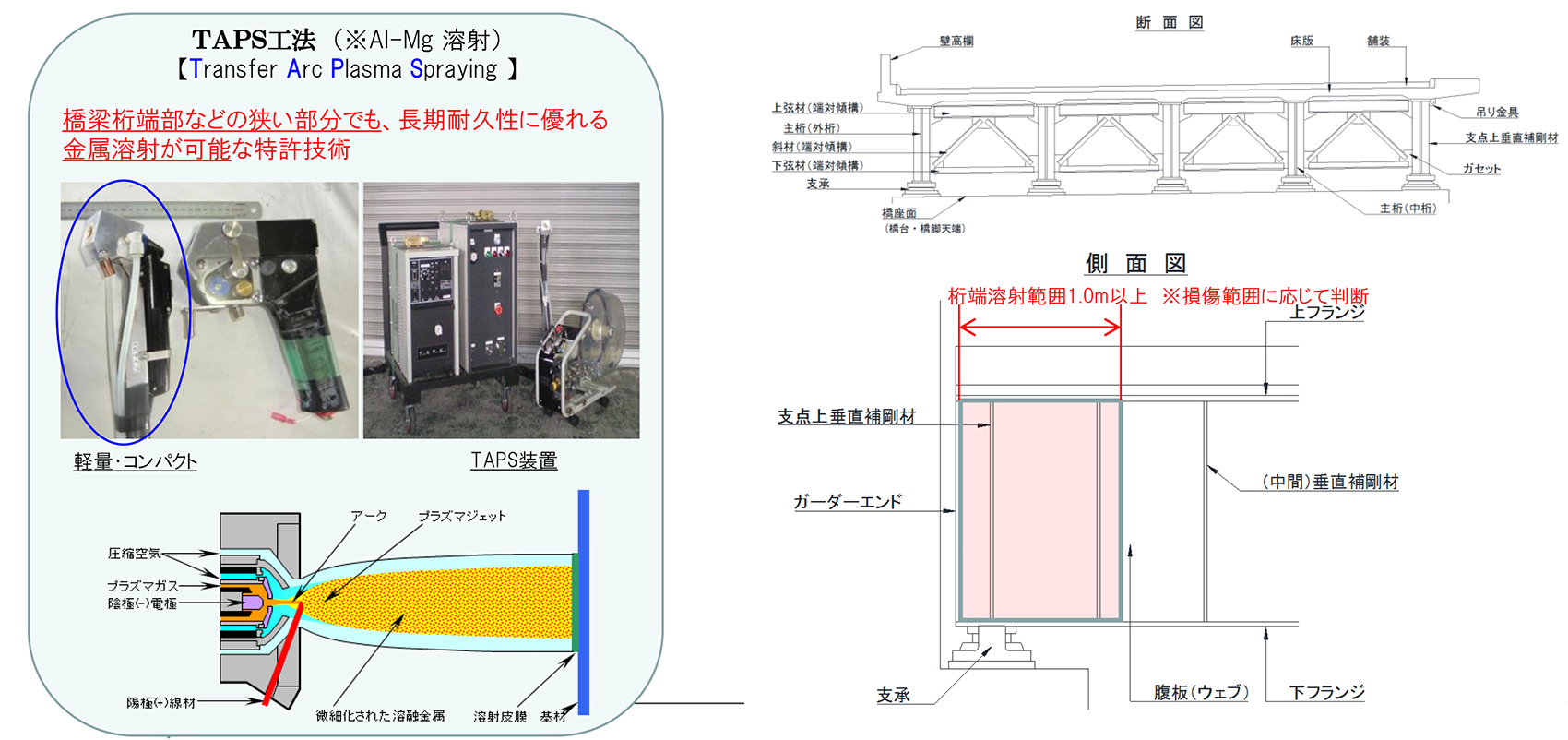 新しい防食手法としては桁端部や添接部を中心に耐久性が高いAlMgプラズマアーク溶射(『TAPS溶射』)を積極的に採用しています。