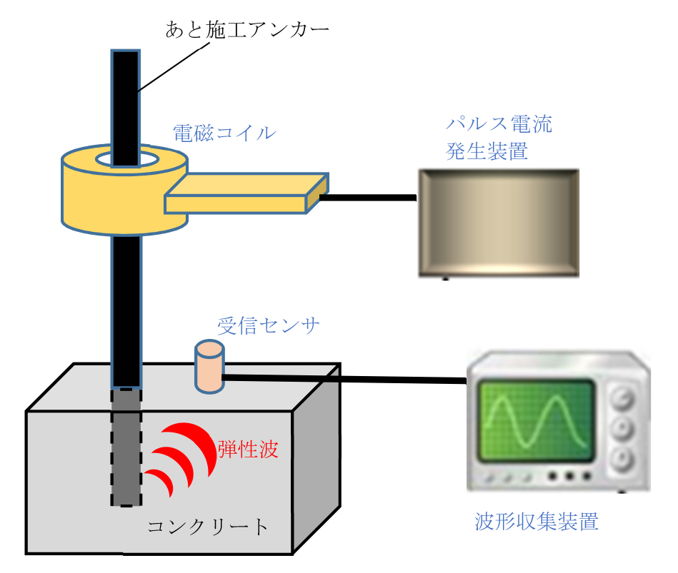 里深 これも大阪大学(鎌田敏郎教授)と共同研究していまして、アミック製の電磁波パルス装置を応用したあと施工アンカーの変状確認方法を開発しています。電磁パルス法とは、励磁コイルにパルス状の大電流を流すことによってコイル周辺に瞬間的に地場(動磁場)を発生させ、生じる電磁力により、コンクリート内部に存在するアンカーボルトを非接触で振動させ、これによって発生する弾性波を捉えることにより、アンカーボルトの状態を評価する方法です。現在は室内試験を繰り返しており、今年度中には実構造物での試験を行いたいと考えています。