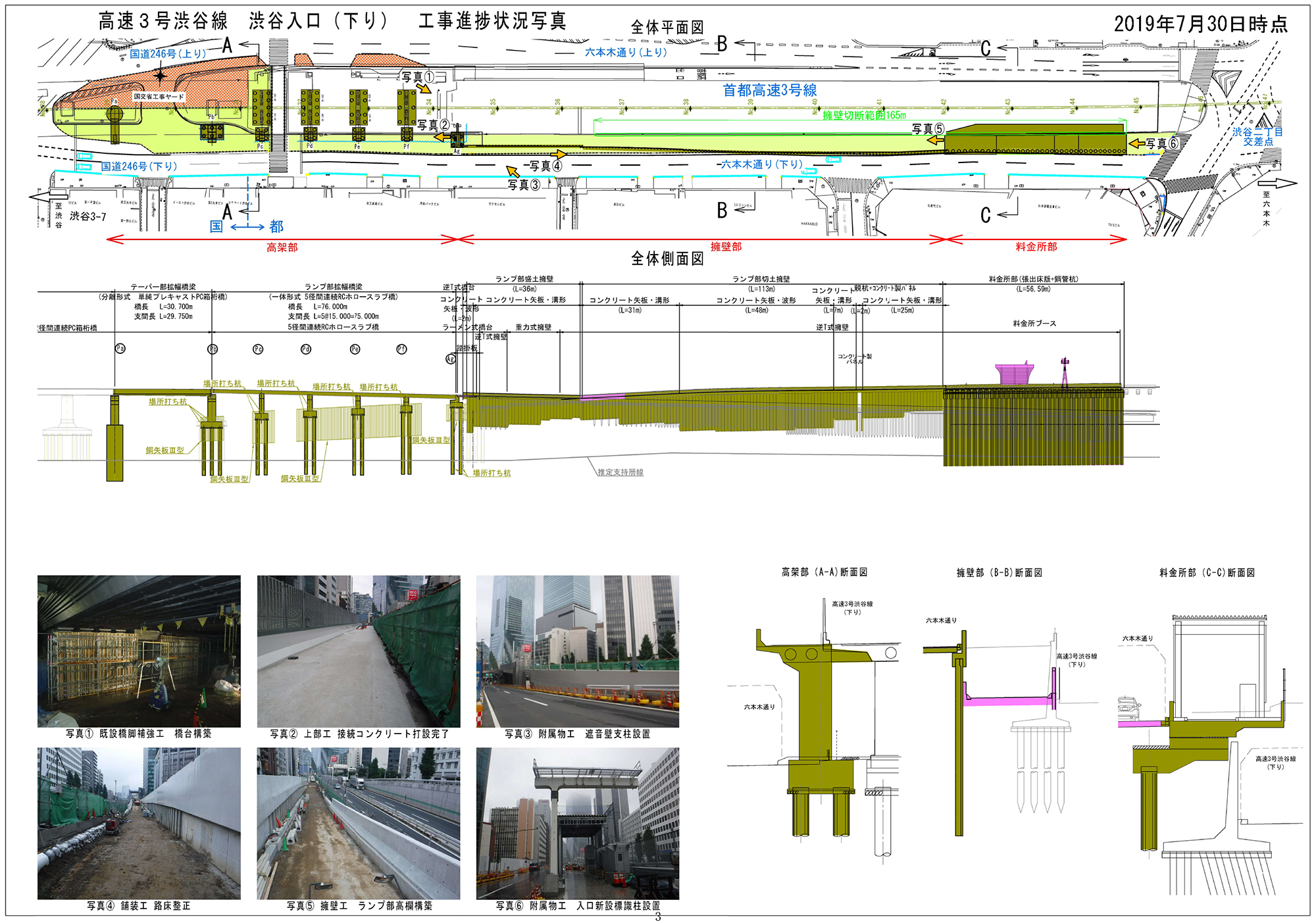 高橋 3号渋谷線本線は、都心側からトンネル状(アンダーパスとトンネルが混在)の道路になっていて、上り勾配で渋谷駅方面に向かっています。半地下構造が途中で地上部になり、橋梁で渋谷駅東口側に入っていく形態となっています。渋谷はもともと窪地で、そこに首都高速をつくるときに、都心方の青山学院の地上部は通れないのでその下を通過して地上に出て、渋谷駅を上越ししている形です。