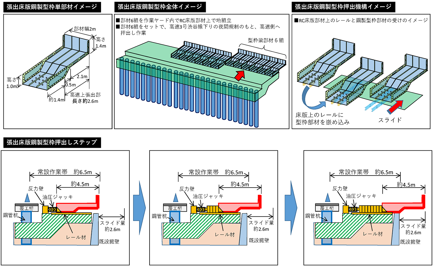 渋谷入口(料金所部) 張出床版鋼製型枠押出し方法ステップイメージ