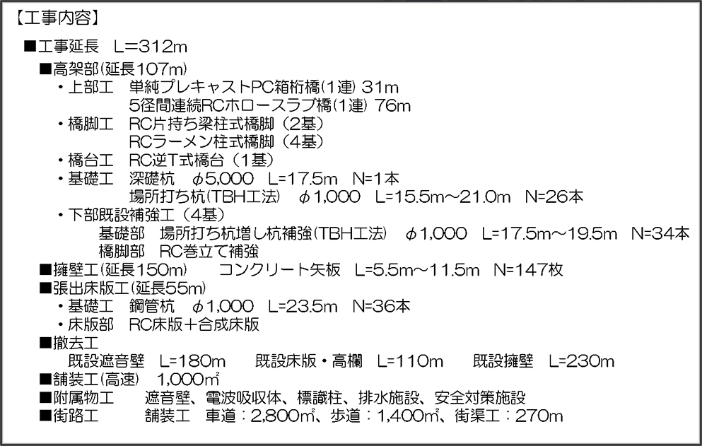 さらに具体的に言いますと、渋谷二丁目交差点の近くに入口を設けて、その先に本線に対してオーバーハングするような出っ張りをつくってその上に料金所を置きます。そこからは本線は上り勾配となっていますがまだアンダーパスなので、入口は擁壁を介して本線に擦り付けていく区間となります。さらに、一部盛土区間があって、終点部は高架区間になっていきます。高架区間はいくつか橋脚があって本線に接続していきます。(さらに断面図で補足)都心側がオーバーハングした構造で、既存の半地下擁壁に荷重をかけることはできないので、別の支持形態で料金所を支持させなければなりませんでした。そのため、T型擁壁の基礎の外側に鋼管杭を1.5m間隔で柱列打設して、それを基礎杭として、下半分RC構造で構築して、さらにその上にデッキ面を搭載しています。下部床版はRC構造(連続している版)でつくって、鋼コンクリート合成床版を載せてあります。その上に料金所の建屋のフレームを載せて、ブースを入れています。この箇所の大きな特徴です。(下工事内容表参照)