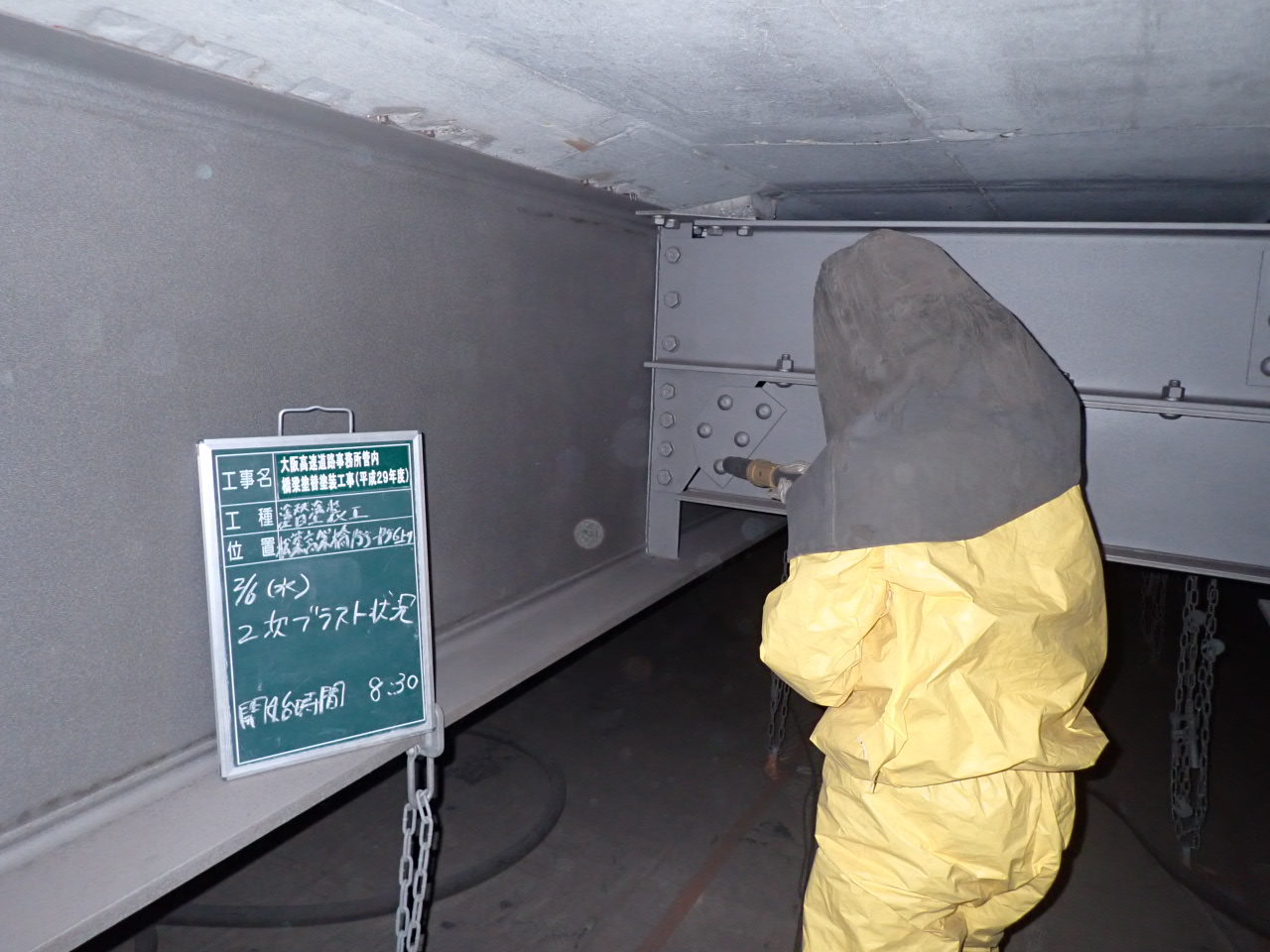 既設塗膜除去は湿潤化(塗膜剥離剤+ブラスト)を採用