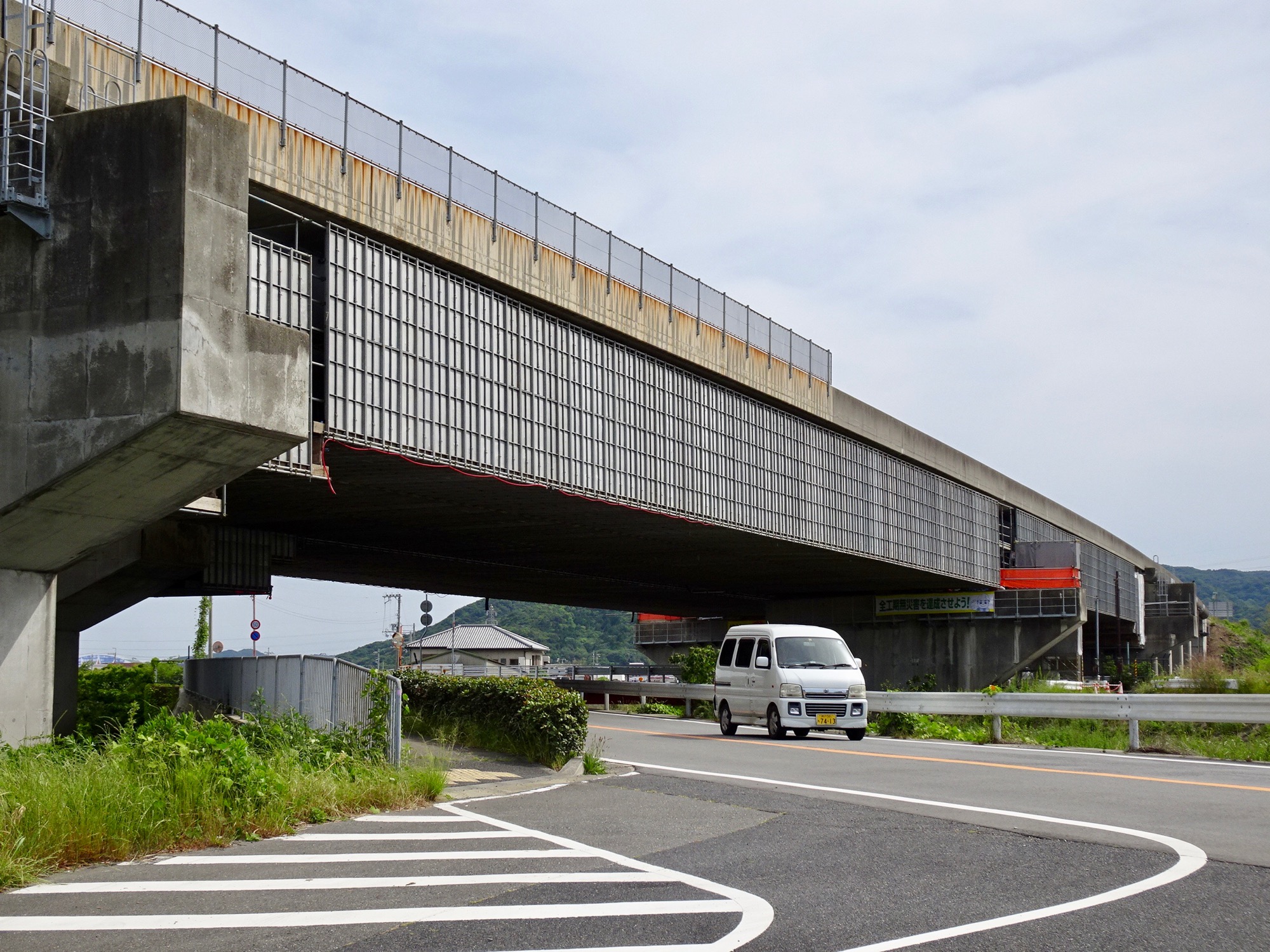 磯江 本線上を跨ぐ橋梁で、RC桁橋、中央分離帯に橋脚があります。橋脚のRC巻き立て、支承補完構造の鋼製ブラケット取付が完了して、年内には洲本市へ引き渡す予定です。