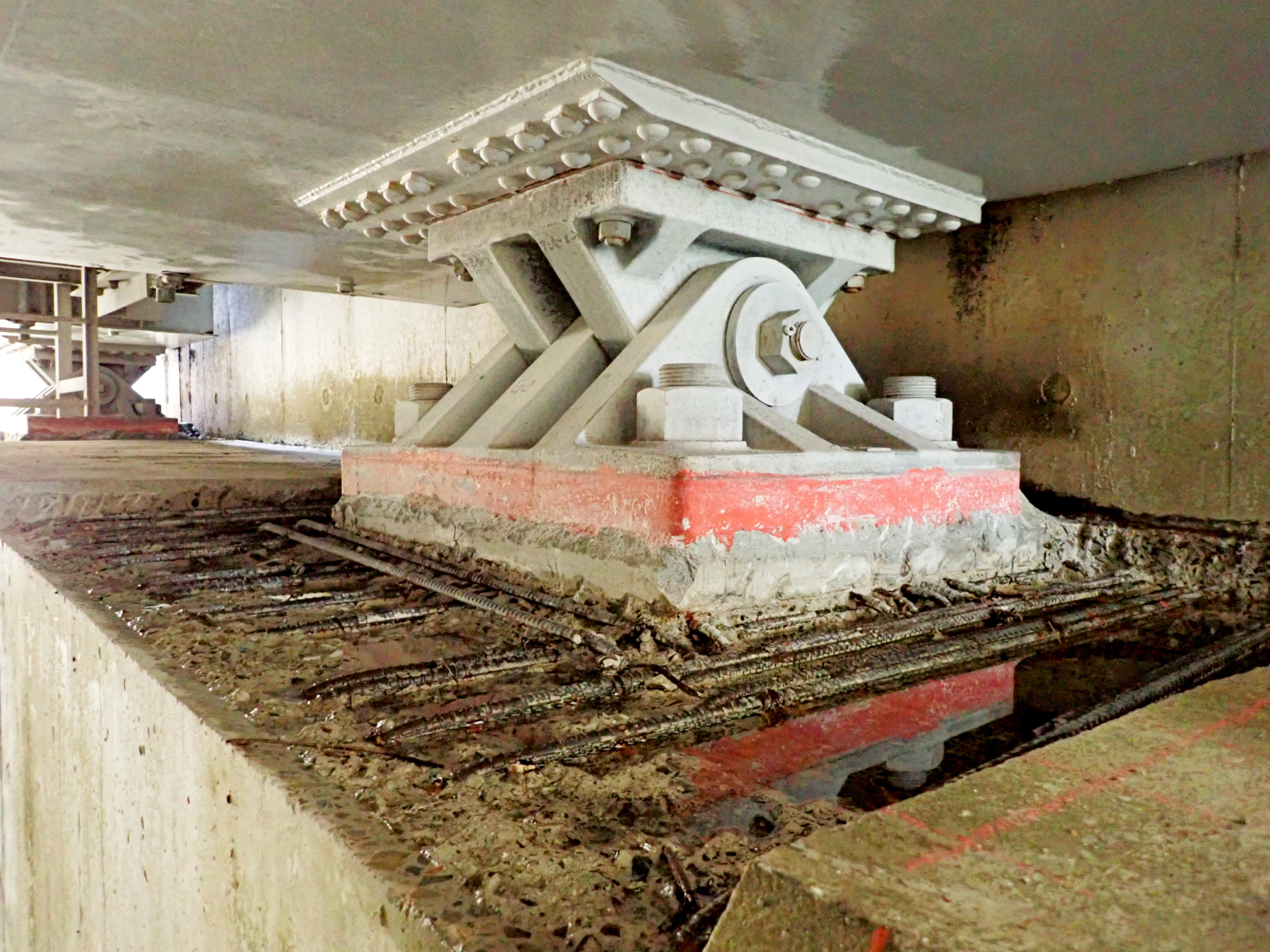 磯江 大鳴門橋では上屋道路桁橋脚の補強、バックステイ径間のトラス支承、鋼床版支承への変位制限構造や段差防止構造等の設置を行い、耐震補強は完了しています。